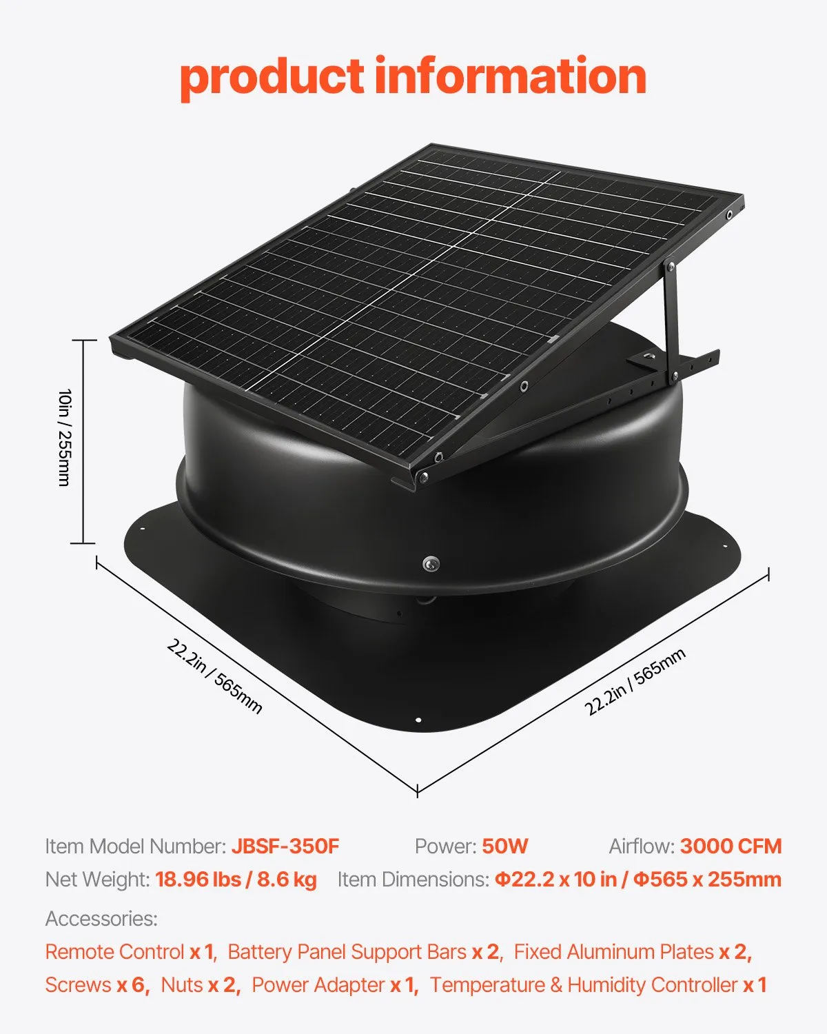 Solárna energia MPPT: Je vám v podkroví príliš horúco? 50W MPPT regulátor optimálne využíva slnečné svetlo na odsávanie teplého vzduchu z podkrovia s chladiacim výkonom až 3000 CFM / 84950 l/min. Náš solárny ventilátor do podkrovia výrazne znižuje vaše náklady na chladenie a je vhodný pre kovové aj murované strechy.