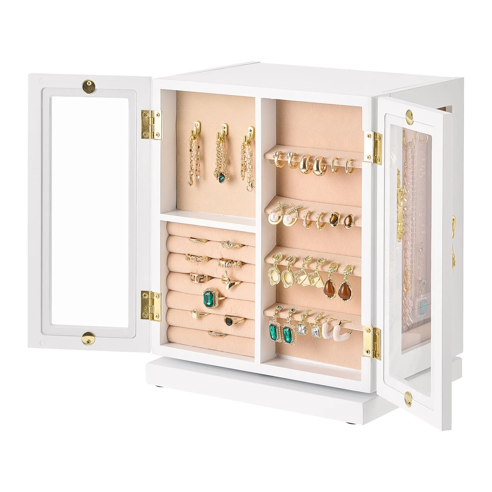 • Elegancia sa snúbi s odolnosťou: Naša šperkovnica sa vyznačuje vysoko kvalitnou kovovou rukoväťou, robustnou konštrukciou z MDF, flanelovou podšívkou a odolnou základňou, ktoré ponúkajú výnimočnú kvalitu, odolnosť a eleganciu.