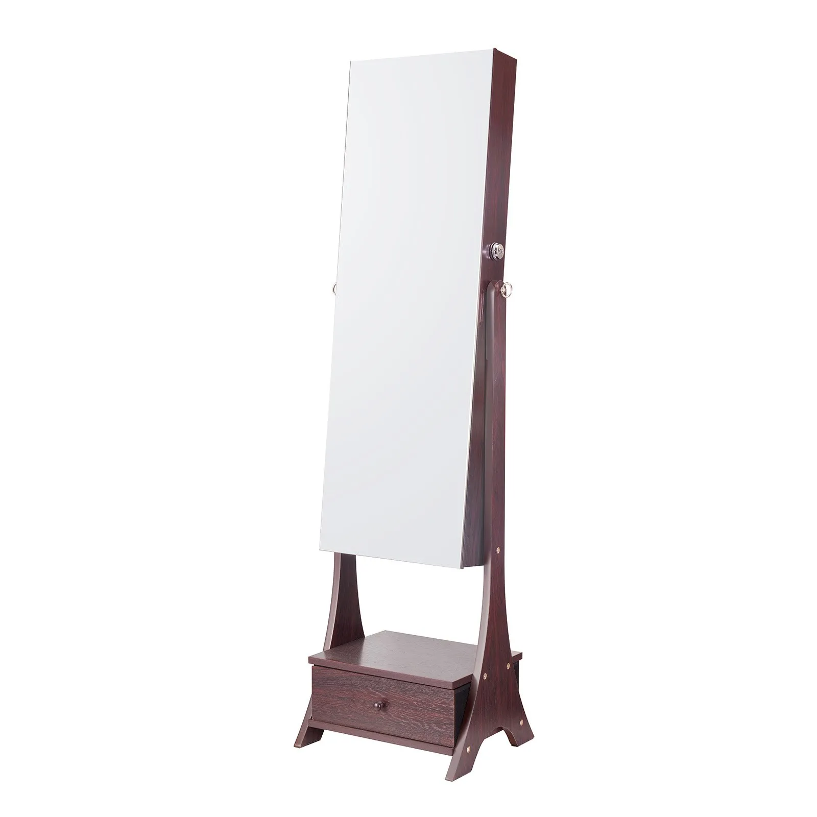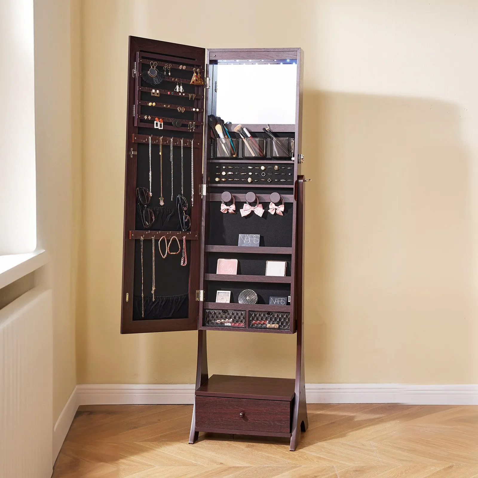 Šperkovnica so zrkadlom, stojace zrkadlo s úložným priestorom, uzamykateľný organizér na šperky so zrkadlom po celej dĺžke, zamatová podšívka, vnútorné LED osvetlenie a zásuvka, hnedá šperkovnica