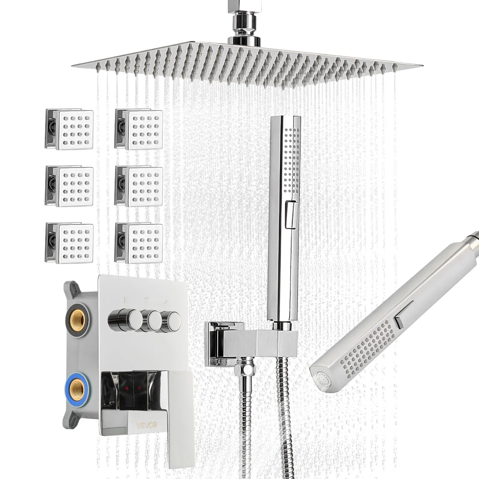 Sprchový systém s 10-palcovým systémom Rain Shower / 6 sprchových trysiek / Ručná sprcha 2 v 1, otočný systém dažďovej hlavice (3 funkcie), mosadzný ventil a kryt, chrómová kúpeľňa