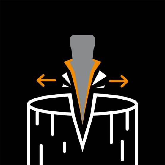 - Nový vylepšený dizajn čepele; širšia čepeľ a štiepací klin zvyšujú výkon a uľahčujú oddeľovanie čepele od dreva