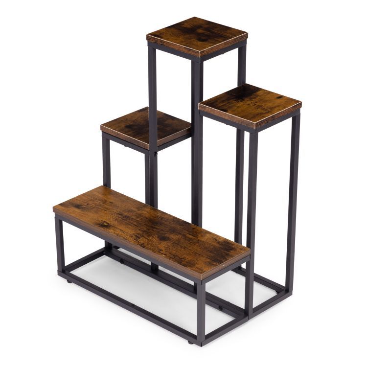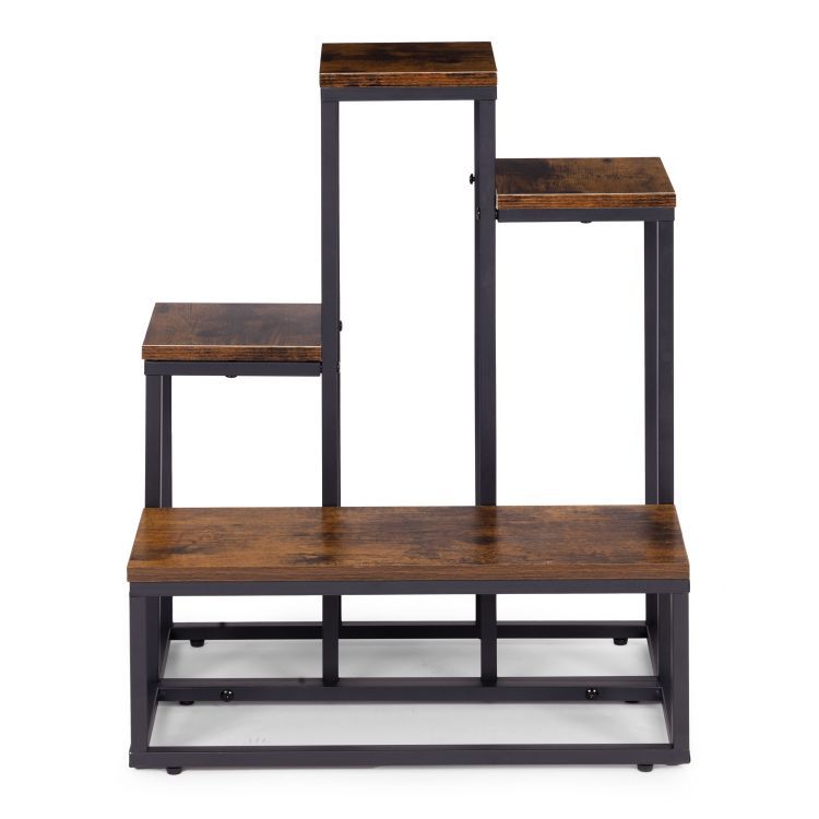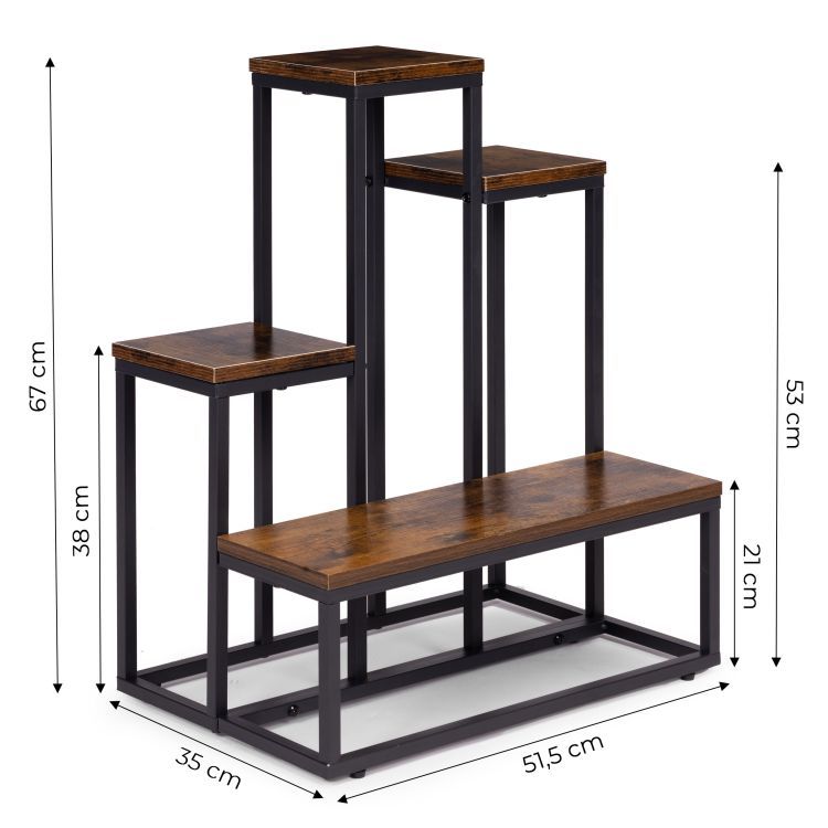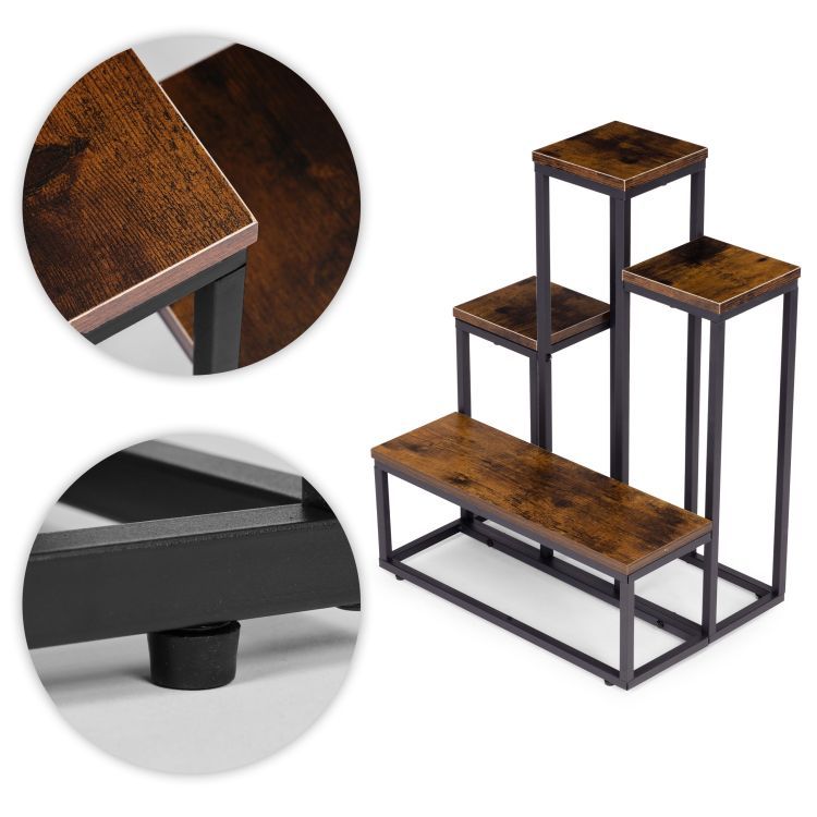 Tento stojaci stojan na rastliny je praktickým a štýlovým riešením v modernom industriálnom štýle . Jeho oceľový rám s práškovou farbou zaisťuje vysokú odolnosť a odolnosť voči korózii a mechanickému poškodeniu. Štyri drevotrieskové police s povrchovou úpravou s efektom dreva dodávajú stojanu eleganciu a prírodný charakter. Jeho stabilná konštrukcia a protišmykové nožičky chránia podlahu a zaisťujú bezpečnosť a istotu stojana počas používania. Maximálna nosnosť 30 kg umožňuje bezpečné vystavenie rastlín, byliniek a dekoratívnych predmetov. Jeho minimalistický dizajn robí zo stojana perfektné riešenie pre každý moderný interiér a prináša doň sviežosť a estetický poriadok.