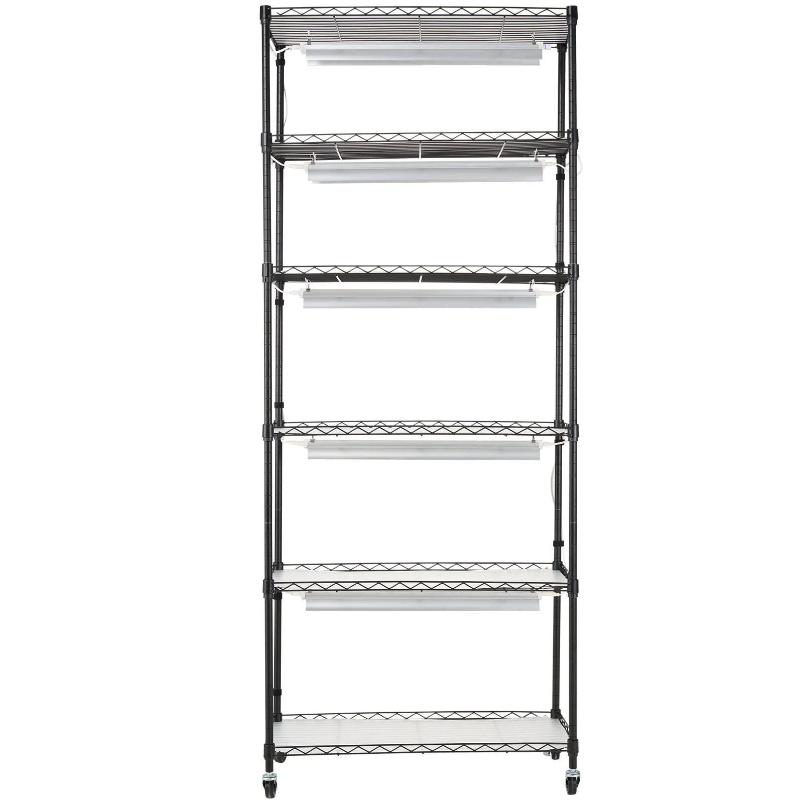 Stojan na rastliny s pestovateľskou lampou, 6-úrovňový 192W kovový stojan na rastliny s pestovateľskou lampou, polica s nastaviteľným rámom a kolieskami na klíčenie semien, 75 x 35 x 180 cm