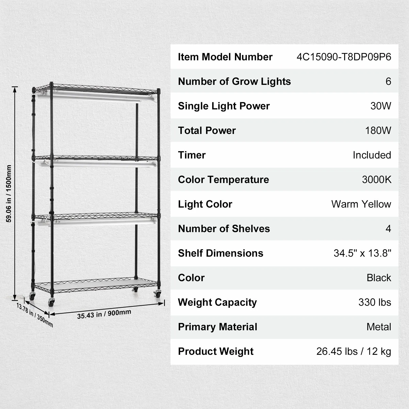 • Odolný stojan na pestovanie rastlín: Tento stojan na rastliny z ocele s vysokou hustotou a pestovateľským svetlom ponúka vynikajúcu odolnosť voči hrdzi a oxidácii. Jeho rozmery sú 35,43 x 13,78 x 59,06 palcov / 900 x 350 x 1500 mm a má štyri police s rozmermi 35,4 x 13,8 palcov / 900 x 350 mm. Unesie až 330 libier / 150 kg, čo vám umožňuje vertikálne vystaviť viacero rastlín v kompaktnom priestore. Je vybavený tromi nastaviteľnými nastaveniami osvetlenia, stačí stlačiť ovládač a spustiť sadenie.