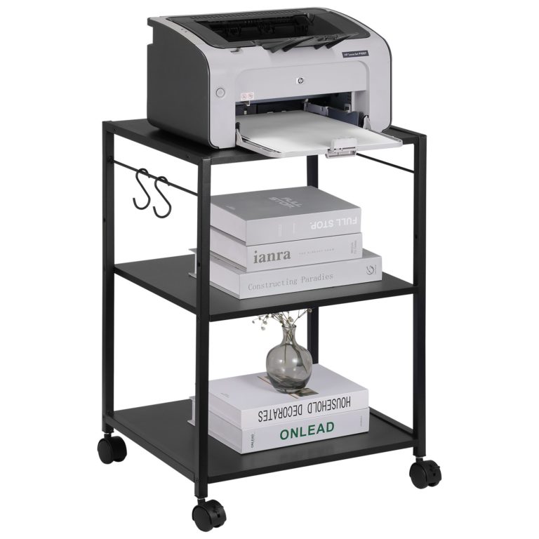 Nastaviteľný: Tento 3-vrstvový stojan na tlačiareň, vyrobený z dosky s hrúbkou 12 mm a oceľového rámu, sa môže pochváliť robustným dizajnom, ktorý unesie až 20 kg na každú vrstvu bez kolísania. Je plne schopný manipulovať s vysokovýkonnými tlačiarňami, počítačovými vežami, skenermi a inými strojmi.