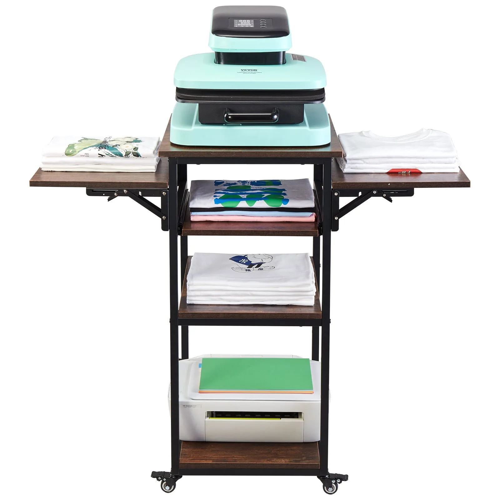 Stôl na tepelný lis s nabíjacou stanicou, 4-úrovňový pohyblivý stojan na tepelný lis, skladací stojan na tlačiareň s kolieskami, kovový pracovný stôl na kolieskach pre sublimačný transferový stroj, hnedý