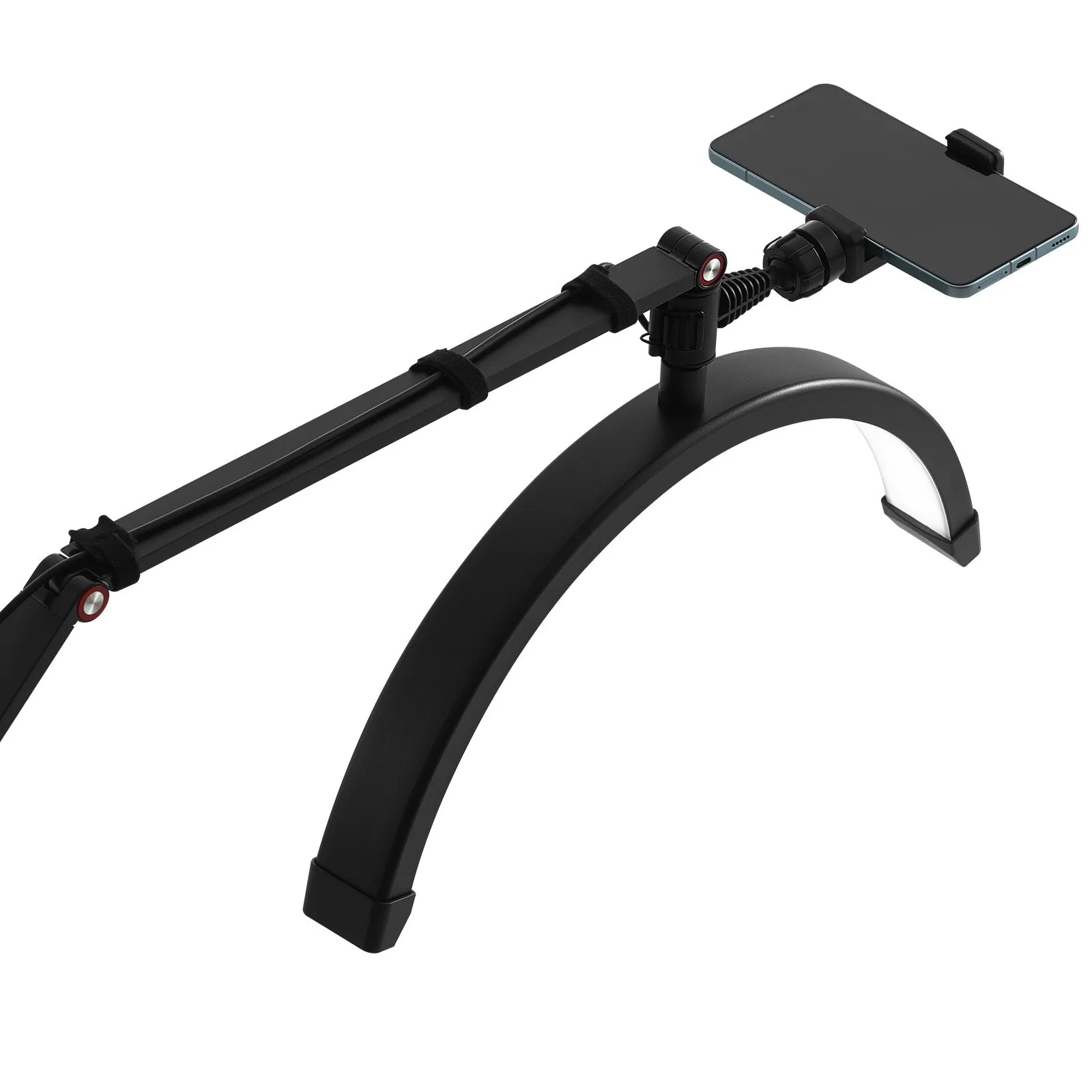 • Flexibilné rameno a držiak na telefón: Svetlo v tvare polmesiaca je vybavené svorkou v tvare C, ktorá je špeciálne navrhnutá pre stiesnené priestory. Hlava lampy sa otáča o 360°, zatiaľ čo rameno je flexibilné a výsuvné, čo ponúka všestranné možnosti nastavenia. Je tiež vybavená nastaviteľným držiakom na telefón, ktorý uľahčuje sledovanie alebo nahrávanie videí.