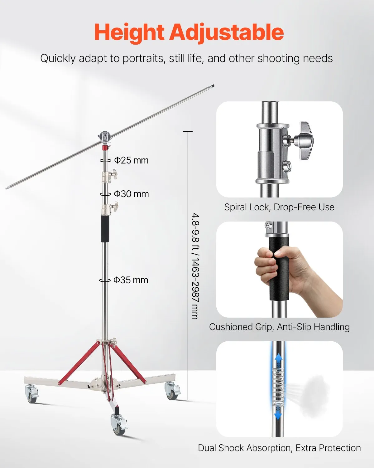 Nastaviteľná výška pre každý záber: Náš nastaviteľný statív s 3-stupňovou stĺpikovou konštrukciou ponúka nastaviteľný výškový rozsah od 1463 mm do 2987 mm (4,8 až 9,8 stôp), čo umožňuje ideálne umiestnenie. Cievkové zámky zabezpečujú, že vaše vybavenie zostane bezpečne na svojom mieste, zatiaľ čo vzduchové a pružinové tlmenie účinne znižuje vibrácie a poskytuje dodatočnú stabilitu a tlmenie nárazov.