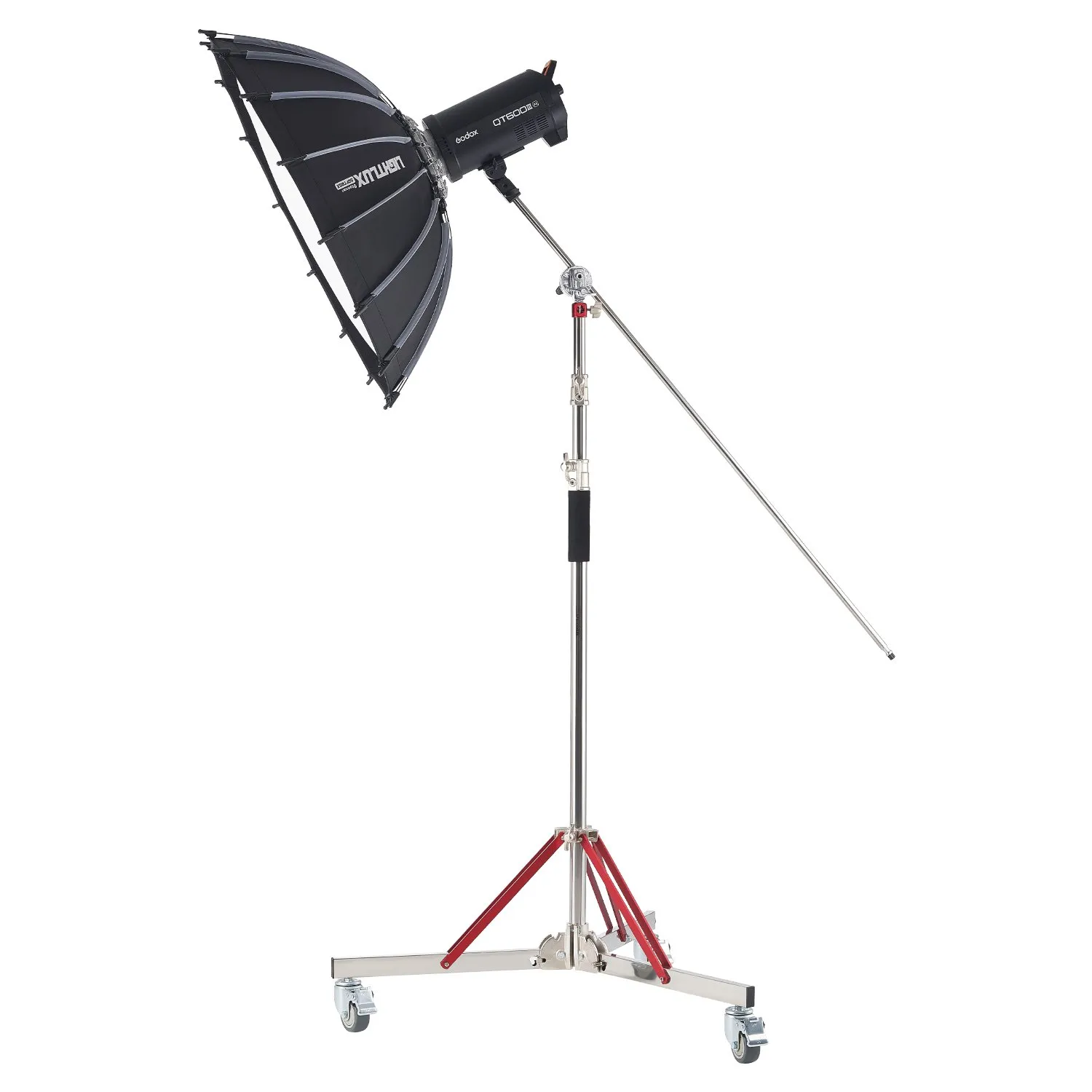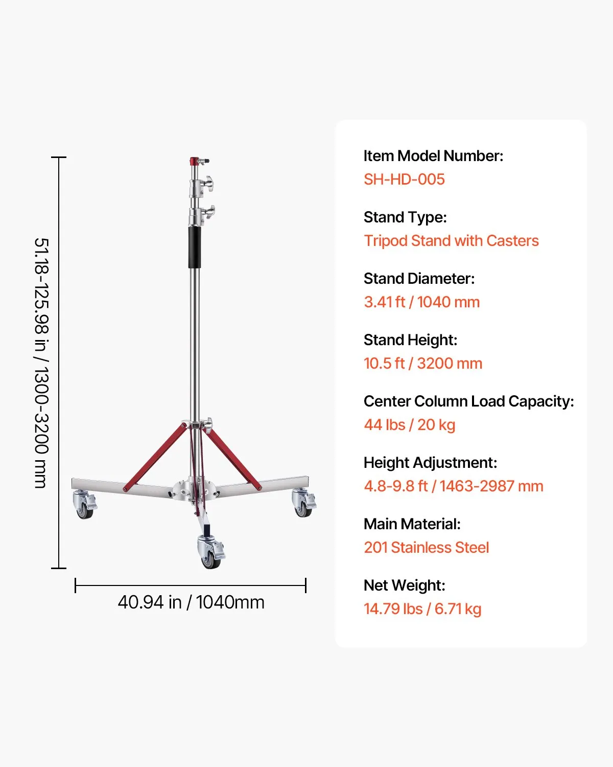 360° kolieska, bezproblémový pohyb: Tento odolný svetelný stojan je vybavený 360° otočnými kolieskami, ktoré umožňujú jednoduché premiestňovanie ťažkých zariadení po podlahe bez nutnosti ich zdvíhania alebo ťahania.