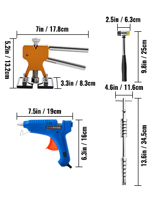 Jednoduché používanie – Priložte vyhrievanú lepiacu tyčinku na výsuvné jazýčky. Priložte záložky k priehlbine; počkajte približne 2 minúty. Umiestnite zdvíhač preliačin a pomaly ťahajte. Naneste trochu alkoholu, odstráňte lepidlo lopatkou. K dispozícii je jedna veľká taška a dve stredné tkané vrecká, vďaka čomu sú nástroje prenosné. Môžete ich použiť kedykoľvek a kdekoľvek.