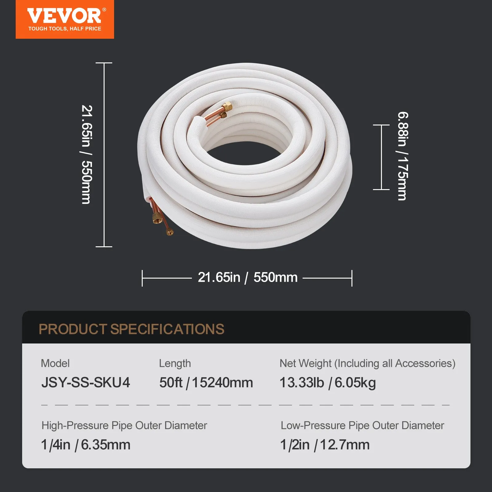 Dvojité vysokotlakové a nízkotlakové potrubie: Vrátane 1/4-palcových vysokotlakových potrubí a 1/2-palcových nízkotlakových potrubí, kompatibilných s delenými klimatizáciami s výkonom 12 000 – 18 000 BTU, špeciálne navrhnutých pre mini delené klimatizácie.