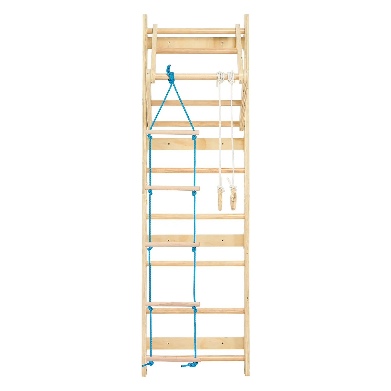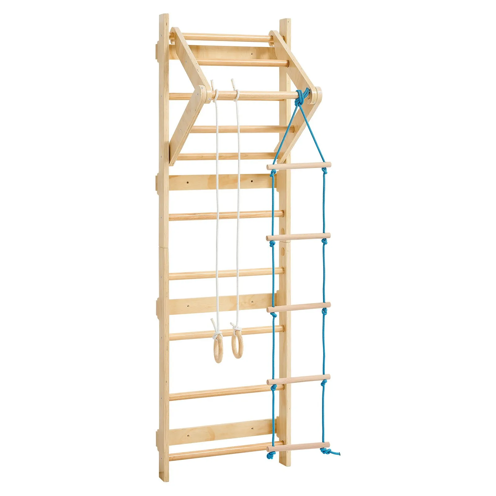 Švédsky rebrík na stenu 4 v 1, 8-stupňová lezecká hračka z masívneho dreva, nosnosť 100 kg, vnútorná lezecká veža s gymnastickými kruhmi, hrazda na zhyby, lanový rebrík, nástenný rebrík