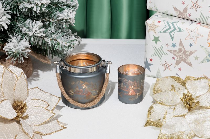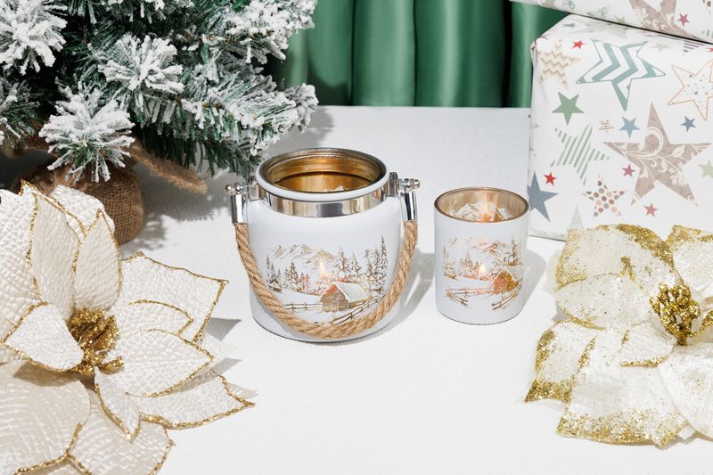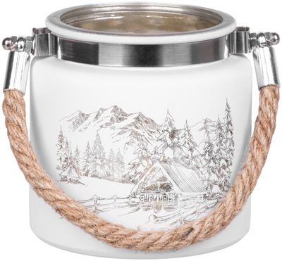 Svietnik MagicHome Vianoce, biely, s krajinkou, s lankom, 10×10 cm