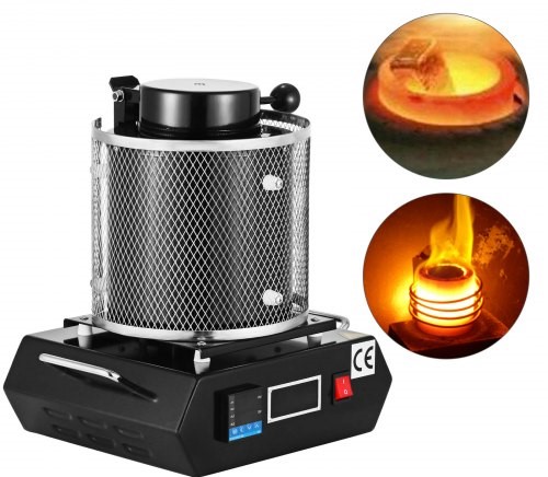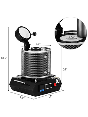 3kg pec – Taviaca pec na zlato s kapacitou 3 kg sa dodáva s grafitovou nádobou, ktorý sa vyznačuje odolnosťou voči vysokým teplotám. Taviace teleso pece sa môže rýchlo zahriať na 1150 ℃ za niekoľko minút. Keď pec pracuje bez nádoby (s nasadeným krytom), môže dosiahnuť viac ako 1000 stupňov Celzia približne za 12 až 20 minút; keď je umiestnený téglik, potrebuje 20 až 30 minút na dosiahnutie týchto stupňov.