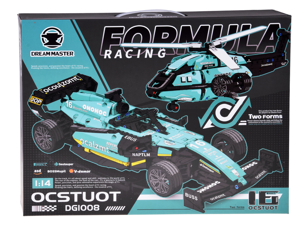 Táto veľká sada kociek pre mladých staviteľov vám umožňuje postaviť dva rôzne modely. Vyberte si medzi pretekárskym autom F1 alebo vrtuľníkom.