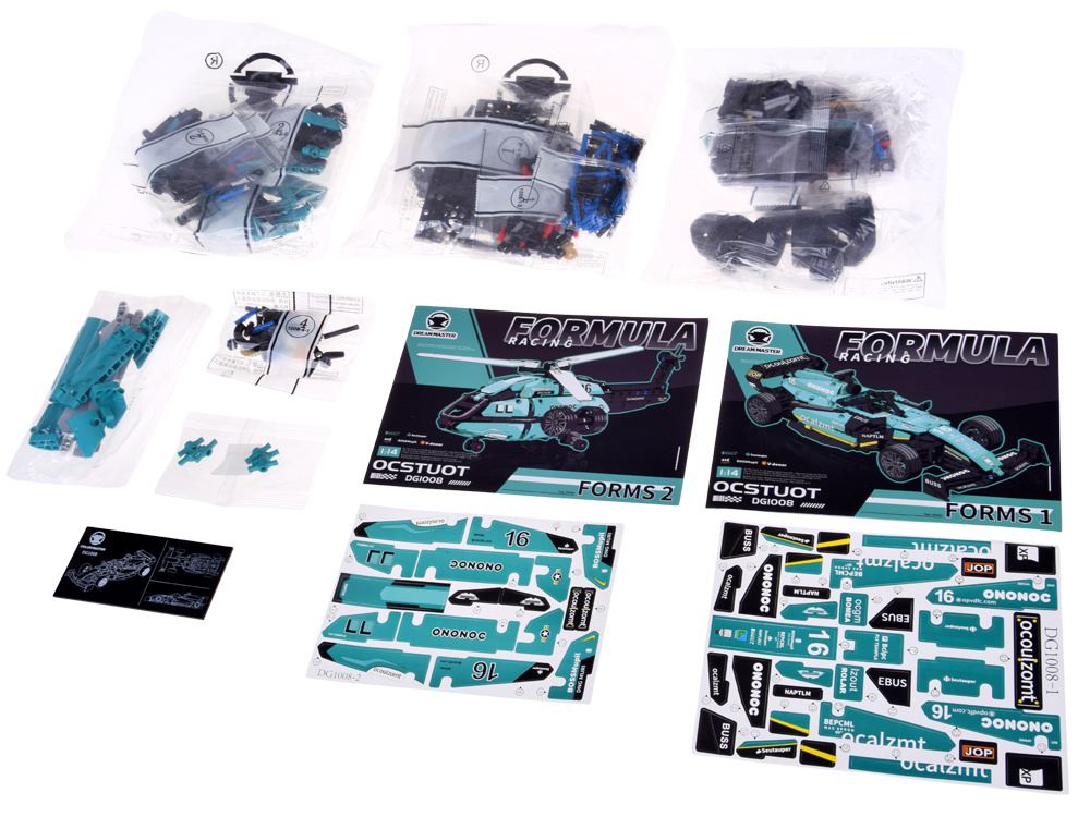 - Na zostavenie sú dva rôzne modely vozidiel – pretekárske auto alebo vrtuľník! (Poznámka: zostaviť je možné iba jeden model)