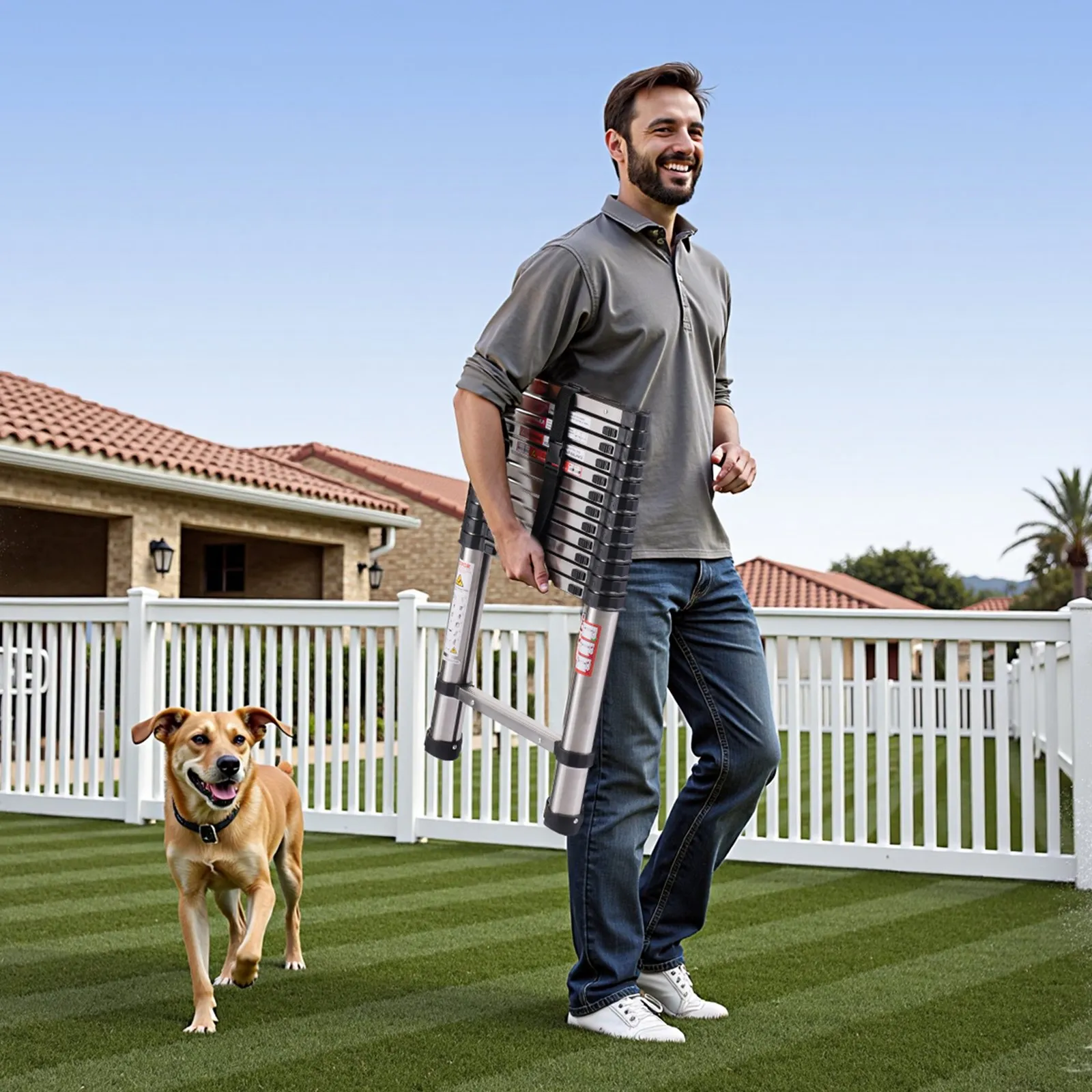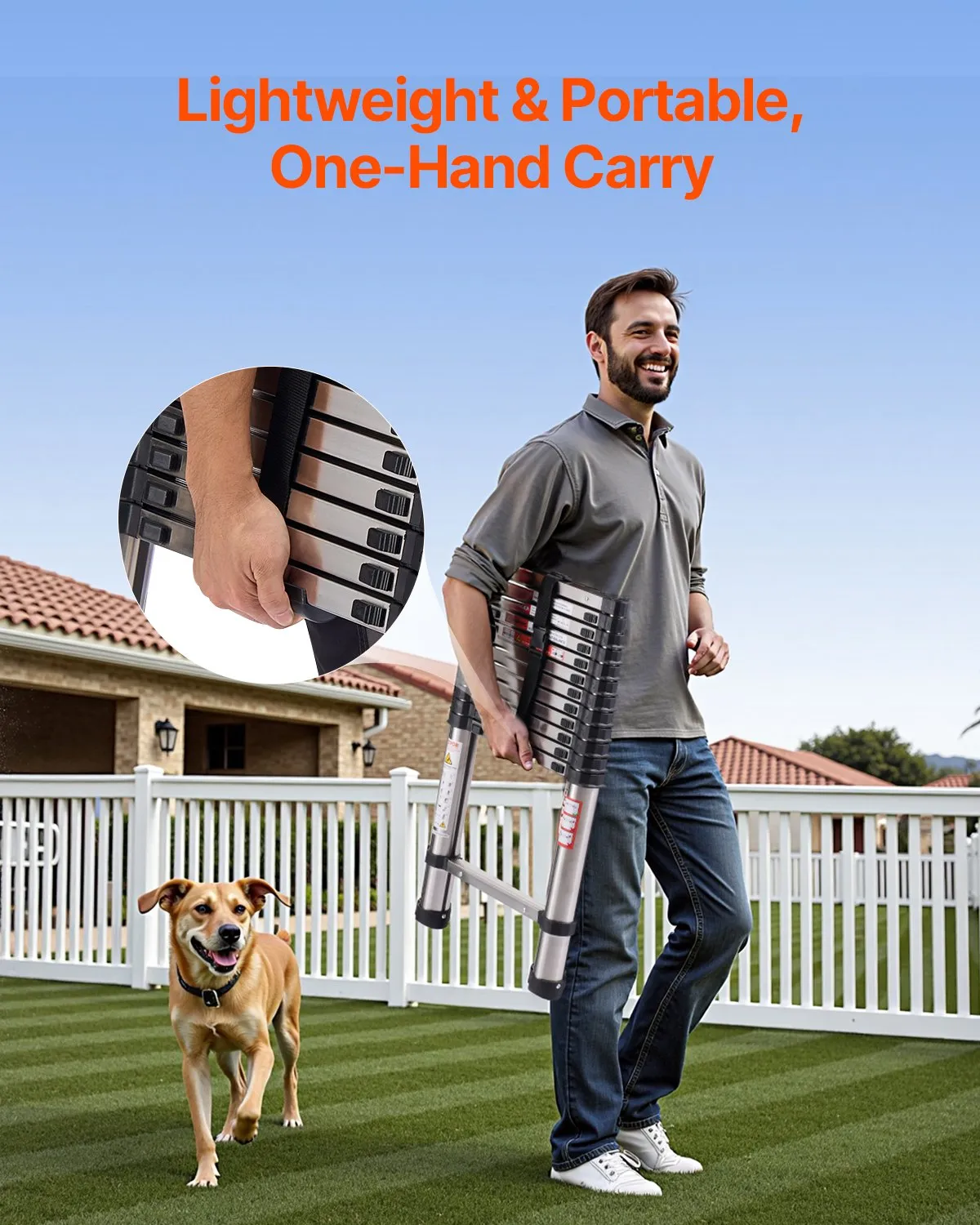 Robustný a odolný: Náš teleskopický rebrík je vyrobený z pevnej ocele a vystužený nylonovými spojkami pre väčšiu stabilitu a odolnosť. Unesie až 150 kg (75°). Pripomienka: 1. Používajte rebrík pod uhlom 75 stupňov; nosnosť sa so znižujúcim sa uhlom znižuje. 2. Nevystupujte po rebríku príliš rýchlo; pri používaní rebríka vždy dbajte na bezpečnosť.