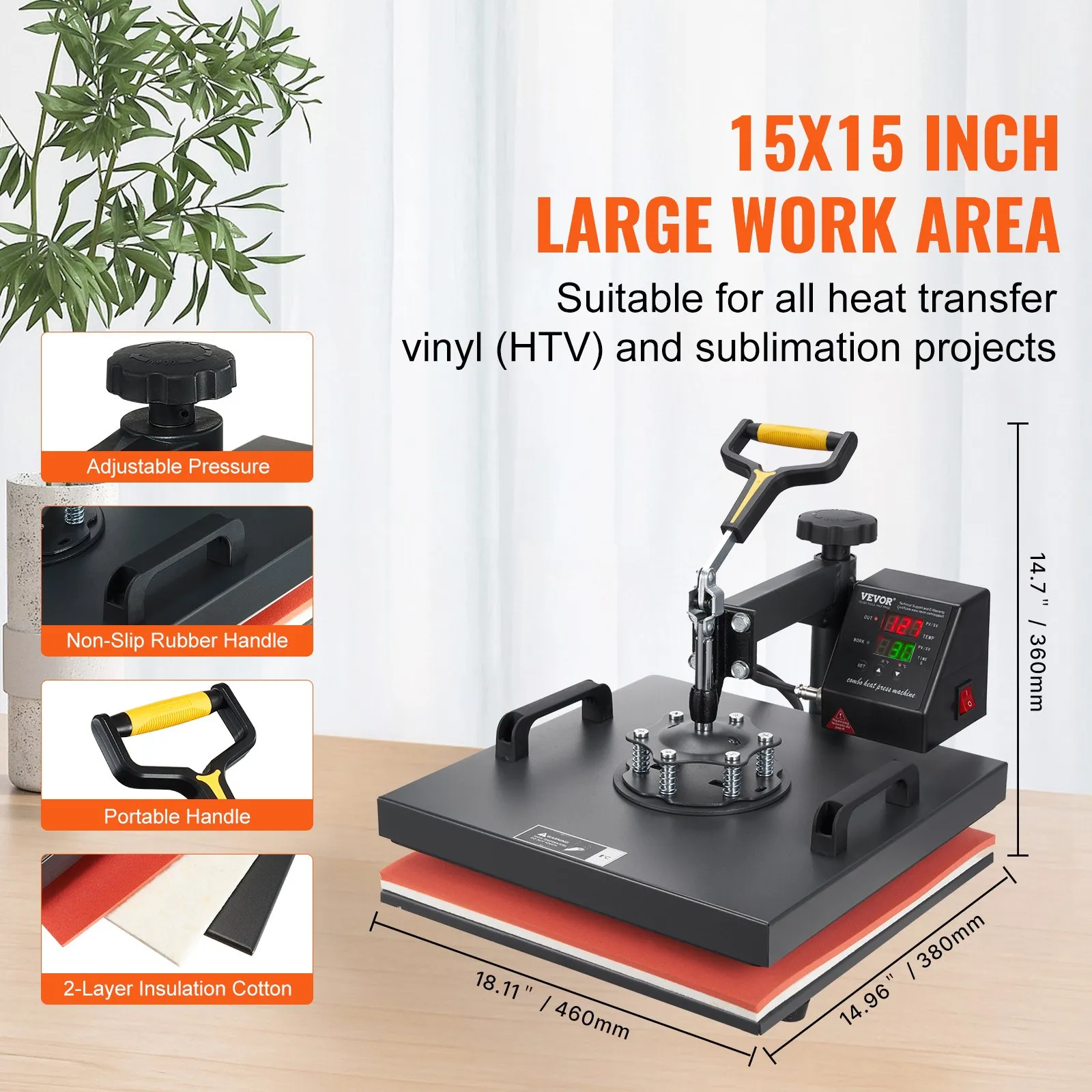 • Tepelný lis 2 v 1: Dve veľké vyhrievacie platne s rozmermi 38 x 38 cm (15 x 15 palcov) a 14 x 7,6 cm (5,5 x 3 palce) sú vyrobené zo silikagélu a peny. Obe zabezpečujú rýchlejšiu rýchlosť ohrevu a lepší prenos tepla. Mäkká vyhrievacia podložka je vhodná pre rôzne materiály a môže tiež zmierniť nepríjemné pachy počas prevádzky.