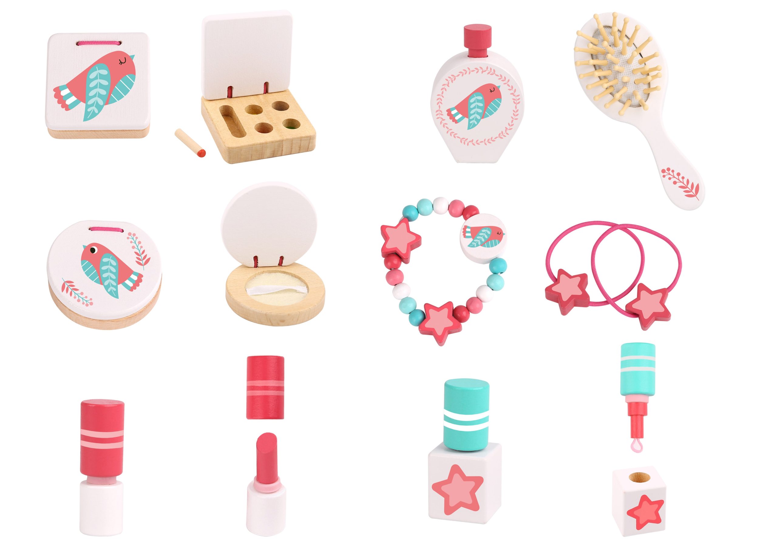 - – sada obsahuje drevené doplnky : lak na nechty, rúž, náramok, náušnice, kefu na vlasy, parfum, kompaktný púder a očné tiene,