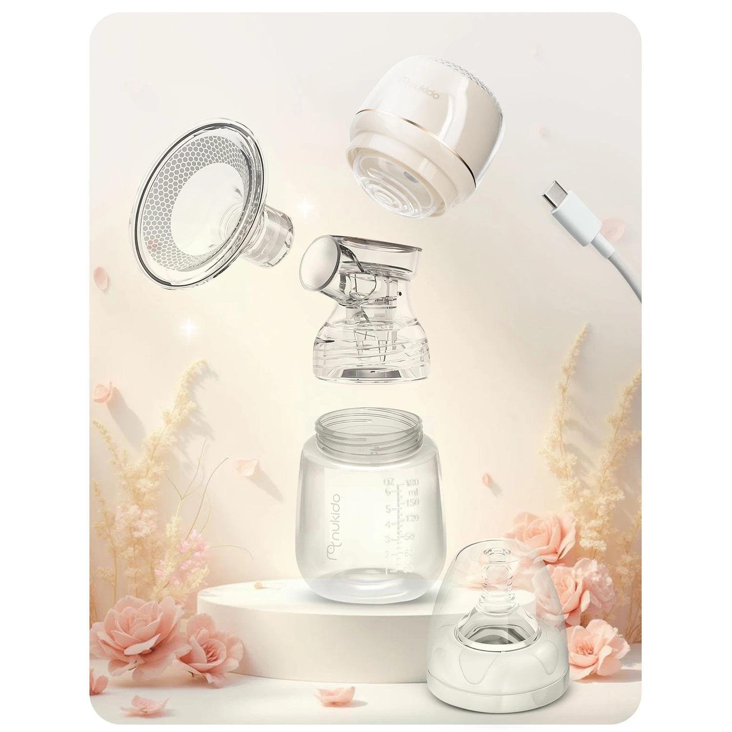 Odsávačka mlieka Nukido funguje bezdrôtovo. Má lítiovú batériu, ktorá umožňuje až 3 hodiny používania na jedno nabitie a nabíja sa pomocou priloženej nabíjačky USB-C.