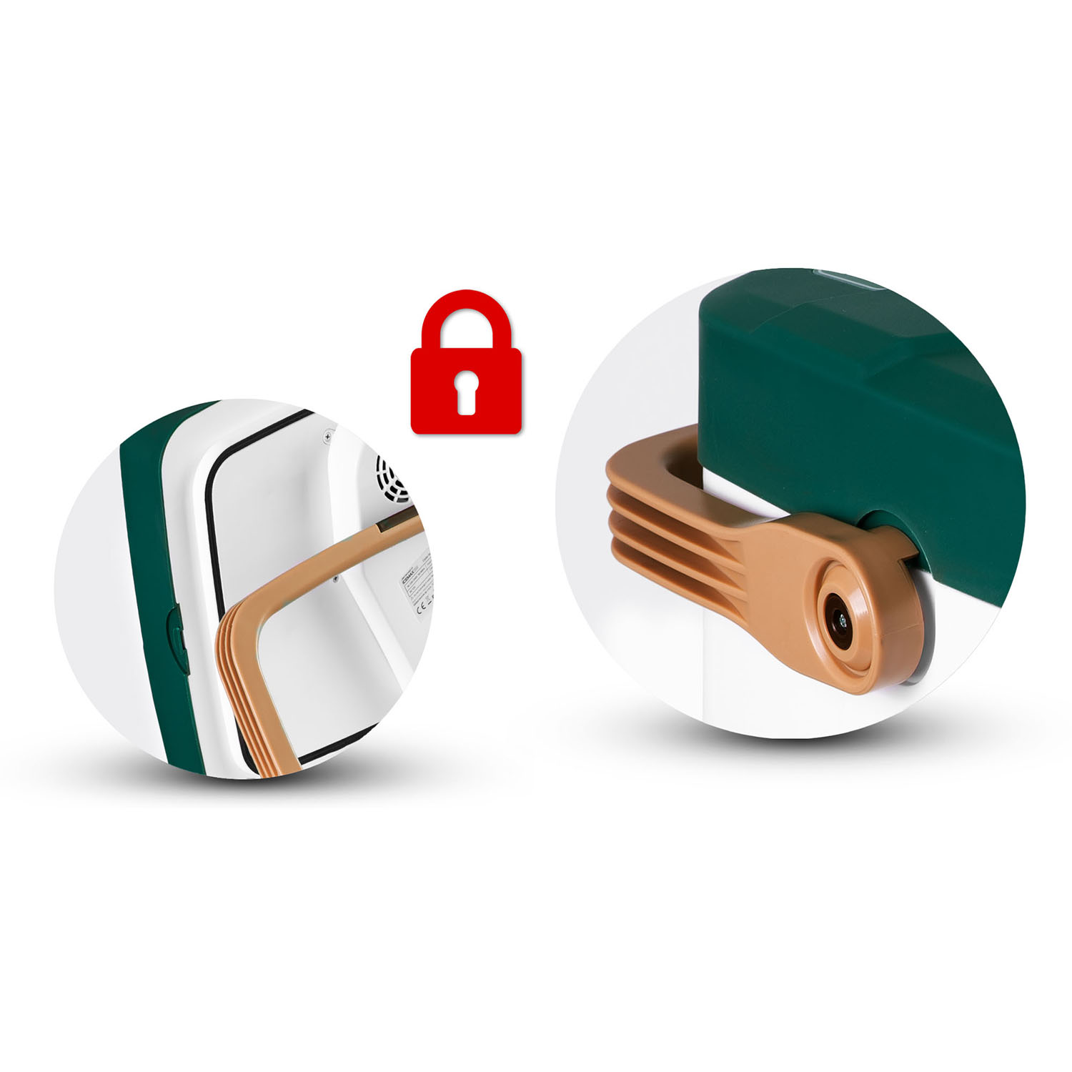 Chladnička má zabudovanú sklopnú rukoväť na prenášanie. Rukoväť chladničky zároveň slúži ako bezpečnostná pracka.