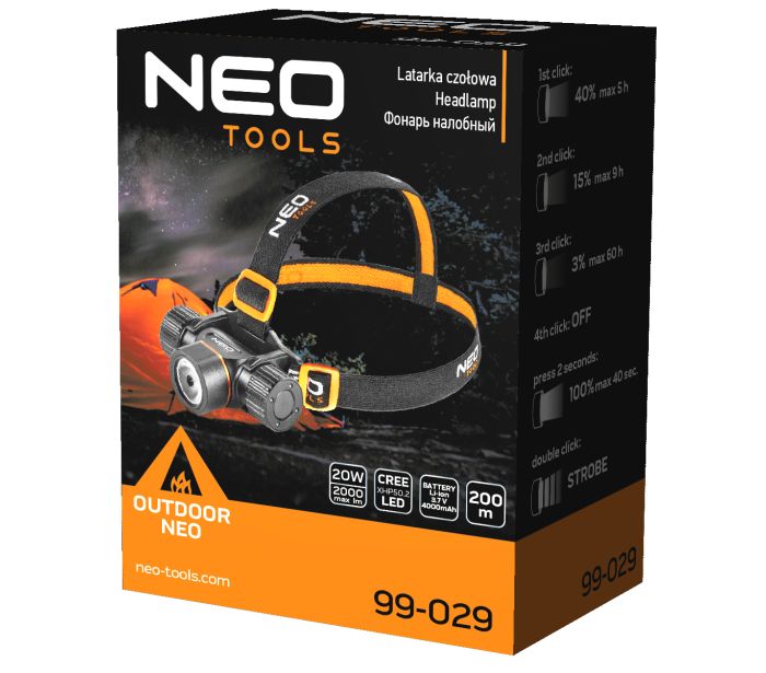 Dobíjacia čelovka NEO (ref. 99-029) je vybavená LED CREE XPG3 s výkonom 20W a maximálnym dosahom 200m. Svietidlo je napájané pribalenou 3,7V Li-Ion batériou s kapacitou 4000 mAh. Telo je vyrobené z hliníka. Baterka má 5 svetelných funkcií: 100%, 40%, 15%, 3% a stroboskop. Čelovku je možné sňať z rukovätí a použiť ako baterku. Súčasťou je aj čelenka a USB kábel.