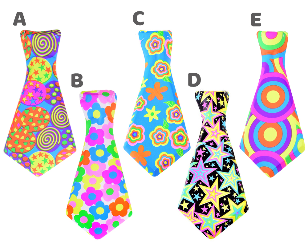 Kravaty majú elastický remienok na krk a sú vyrobené z pružného syntetického materiálu. Tieto odolné voči škvrnám, veselé kravaty dokážu rozžiariť každý domov, školu alebo inú udalosť.