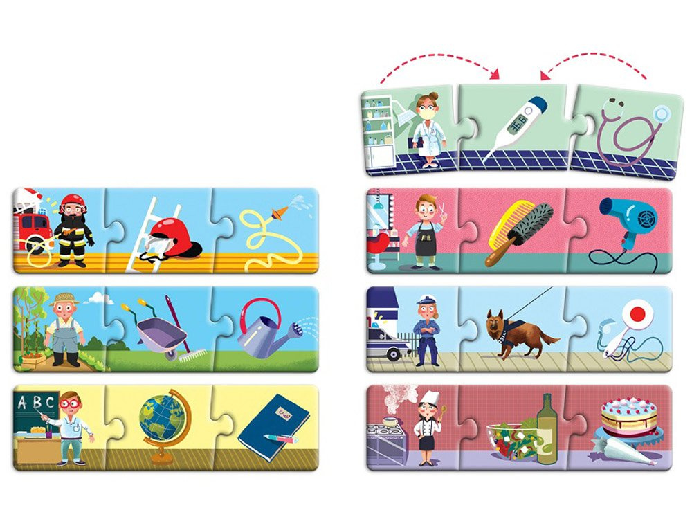 Úlohou dieťaťa je poskladať všetky dieliky do trojdielnych puzzle. Počas hry sa môžu rozprávať o povolaniach, ktoré sa naučili, a je to dobrá príležitosť prediskutovať, čím by sa chceli v budúcnosti stať. Prostredníctvom hry si deti rozvíjajú vedomosti o svete okolo seba, rozvíjajú vnímavosť, zisťovanie faktov a analytické myslenie. Precvičujú si sústredenie a koordináciu ruka-oko.
