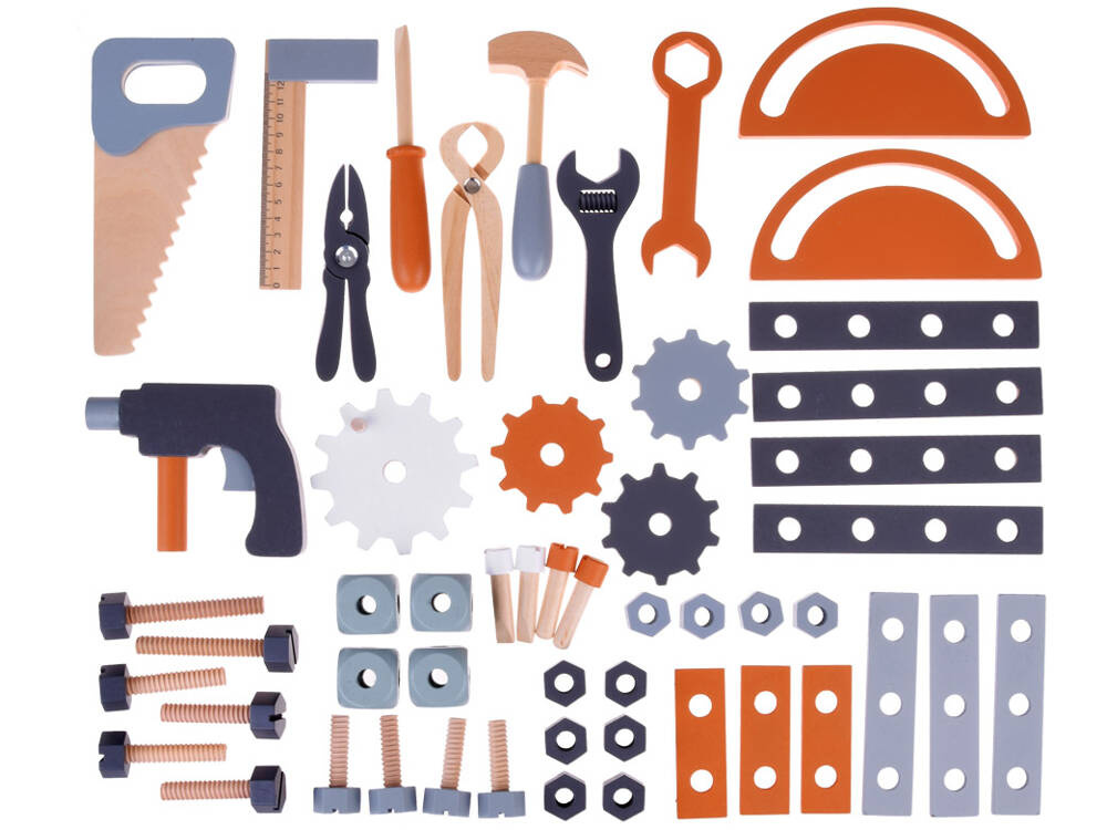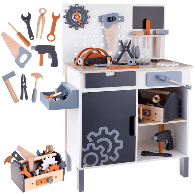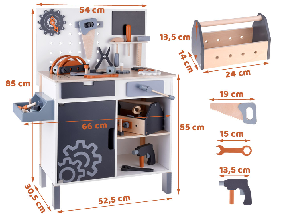 Táto veľká drevená dielňa pre malého kutila je nadčasová a úžasná hračka, ktorá určite poteší každého chlapca. Sada pozostáva z množstva drevených dielov a takmer 55 doplnkov a obsahuje všetko, čo profesionálna dielňa potrebuje. Nájdete v nej základné náradie vrátane skrutkovača, kladiva, skrutiek, ozubených kolies, matíc, krajčírskeho metra, klieští, píly, kľúčov a ďalších vecí. Obsahuje tiež priestrannú krabicu s náradím, čiernu tabuľu a hodiny s pohyblivými ručičkami. Toto množstvo dielov umožňuje nekonečné hranie v prosperujúcej opravovni. S jednotlivými dielikmi sa dá hrať, takže zábava nikdy neprestane.