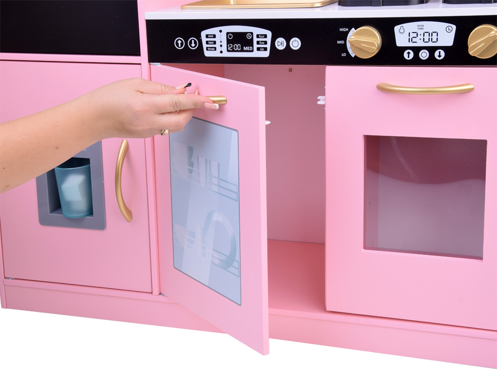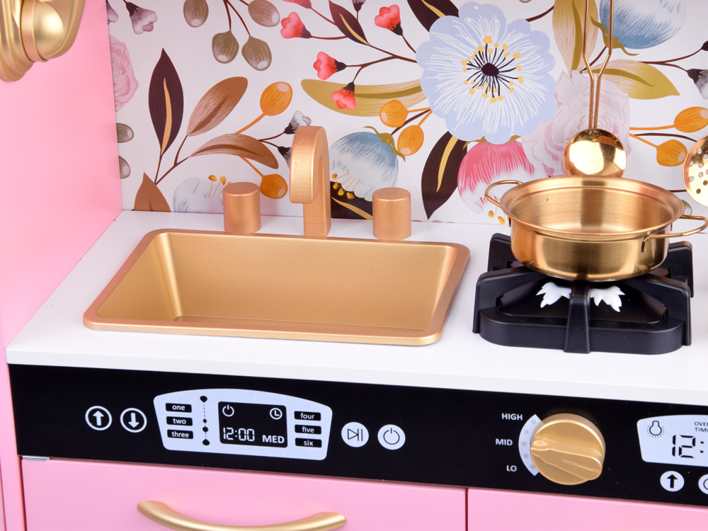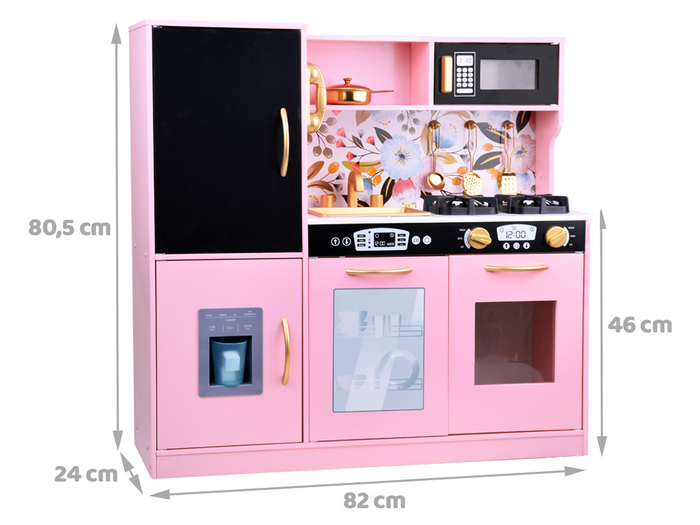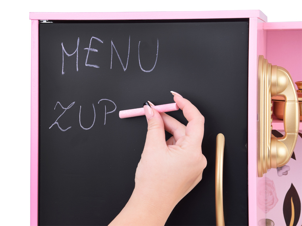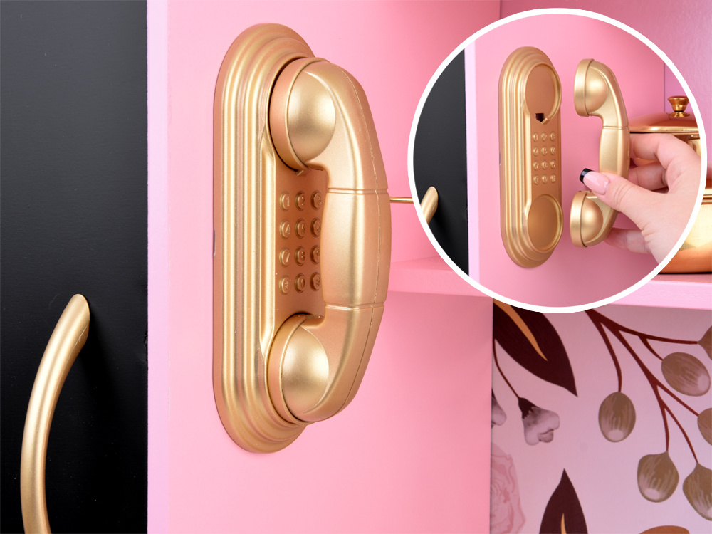 Kuchyňa v retro štýle bola vyrobená s dôrazom na detail. Dominantná ružová farba je zvýraznená čiernymi prvkami a zlatými akcentmi, čo celému kuchynskému riadu dodáva skutočne elegantný vzhľad. Výrazný kvetinový vzor na stene dokonale dopĺňa celkový dizajn. Táto výrazná kuchyňa bude krásnym doplnkom každej detskej izby.