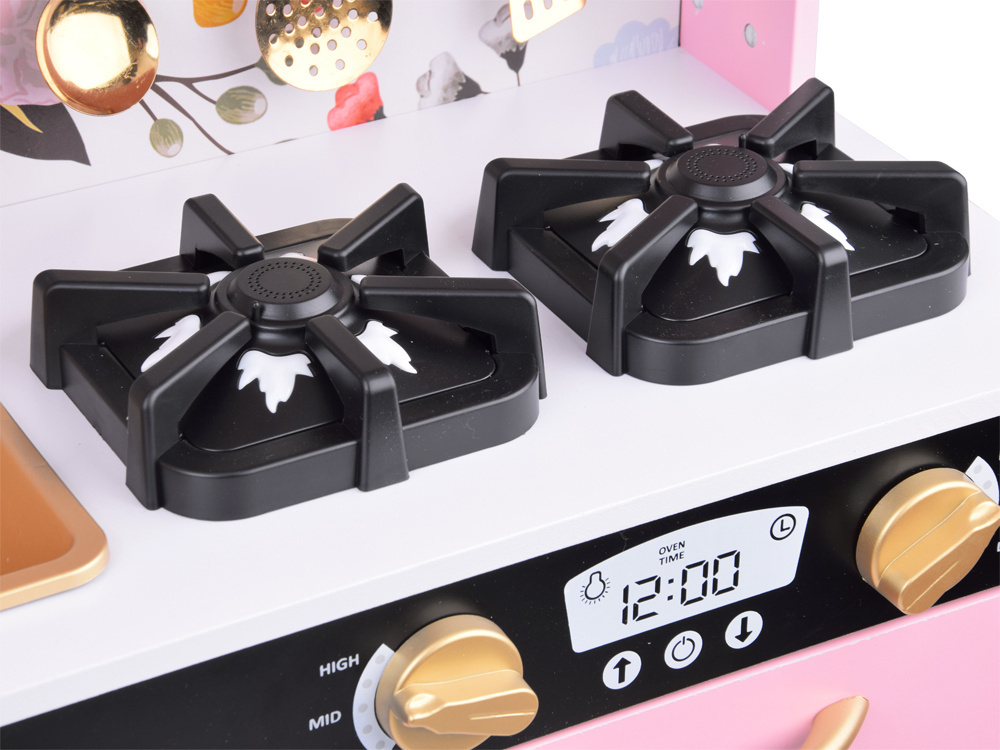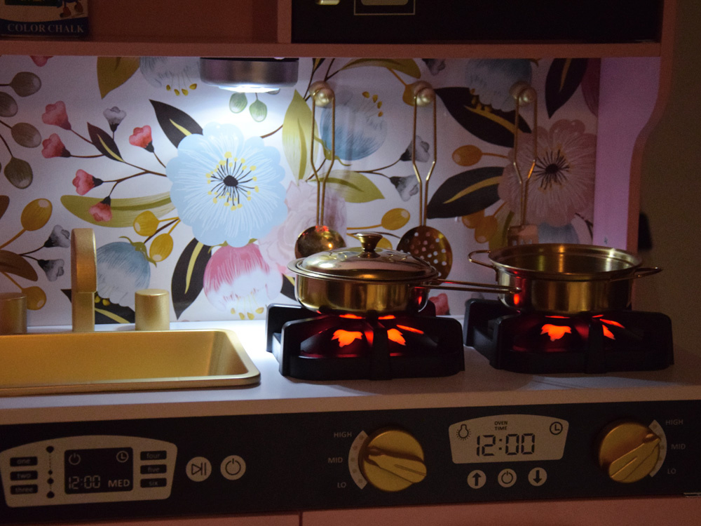 - 2 horáky so zvukovými a svetelnými efektmi – keď na ne položíte hrniec, budete počuť zvuk varenia alebo vyprážania, sprevádzaný červeným svetlom imitujúcim plamene,