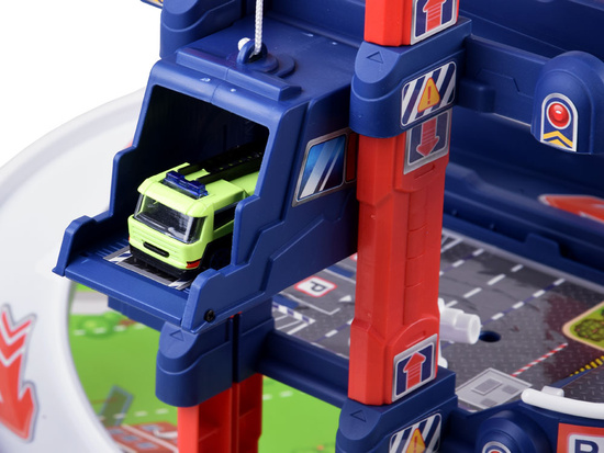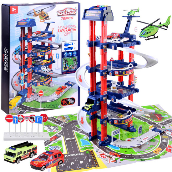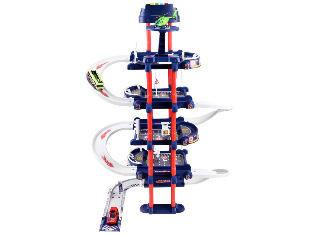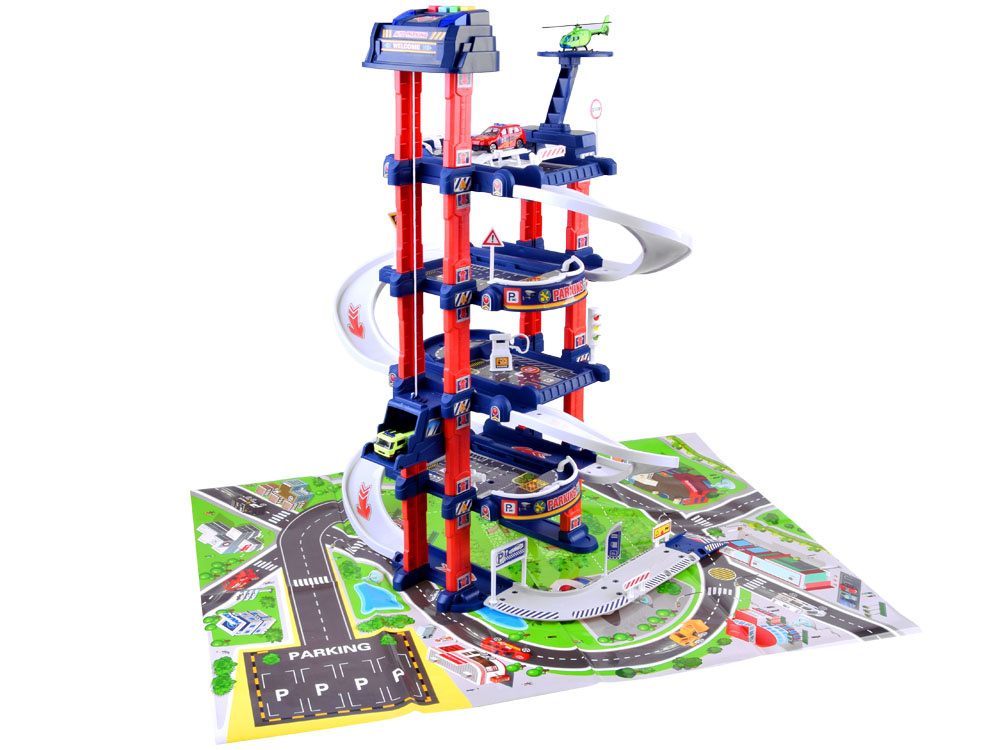 Fantastické viacposchodové parkovisko s čerpacou stanicou, výťahom, autoservisom a pristávacou plochou pre vrtuľník. Parkovisko je vhodné pre „pružiny“. Výťah umožňuje autu pohybovať sa medzi jednotlivými parkovacími úrovňami. Ak vám dôjde benzín, môžete jednoducho natankovať na čerpacej stanici. Keď potrebujete opraviť auto, použite výťah na opravu podvozku alebo výmenu pneumatiky. Sada obsahuje mnoho ďalších prvkov, ktoré výrazne zvyšujú zábavu, ako sú dopravné značky a kužele.