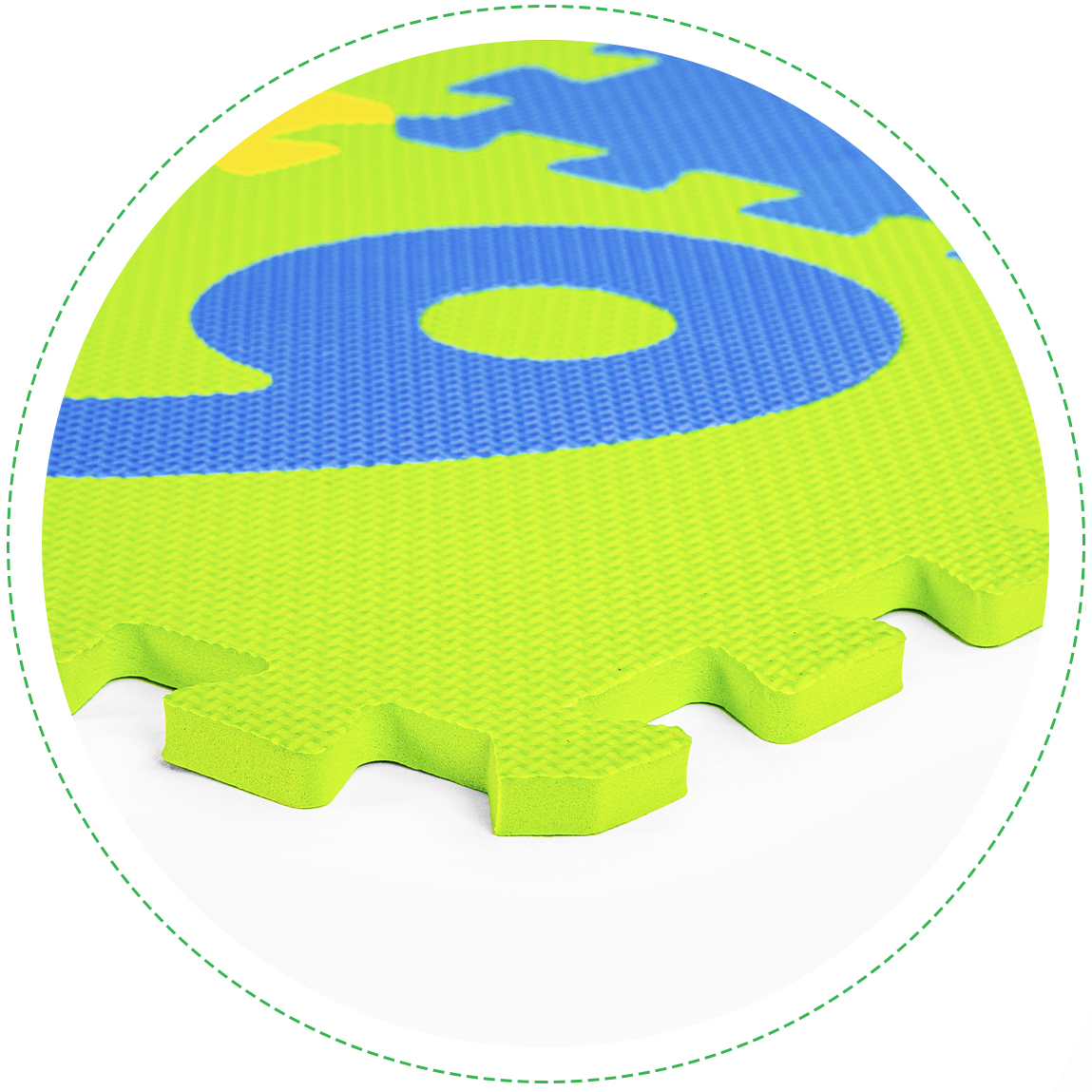 • Podložka pozostáva z farebných štvorcov, ktorých okraje majú špeciálne „zuby“, vďaka ktorým sa dajú ľubovoľne kombinovať. Hrúbka podložky (0,9 cm) poskytuje vhodnú ochranu pri pádoch a robí ju príjemne mäkkou.