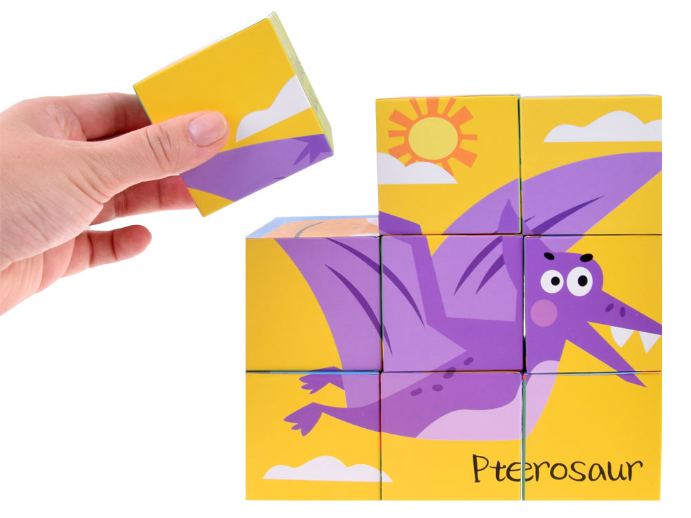 Táto fantastická sada stavebných kociek s dinosaurami je ideálna pre každého, kto je nadšený týmito prehistorickými tvormi. Sada sa skladá z 9 veľkých, krásne navrhnutých kociek, z ktorých každá má svoj vlastný jedinečný dizajn, čo vám umožňuje zostaviť 6 obrázkov dinosaurov . Kocky sú starostlivo vyrobené s vynikajúcou grafikou a sú vyrobené z hrubého kartónu, vďaka čomu sú ľahké a ľahko sa skladajú.