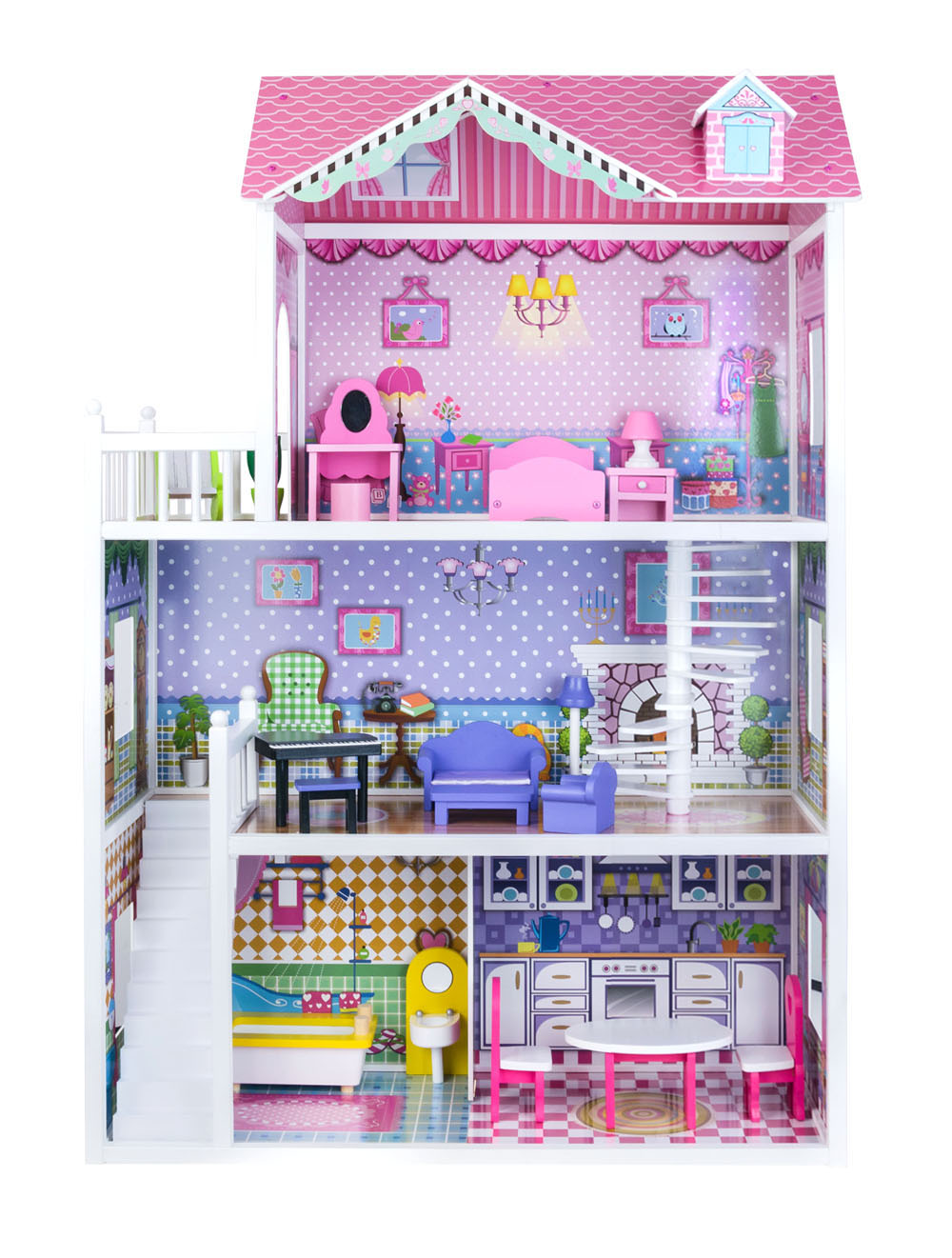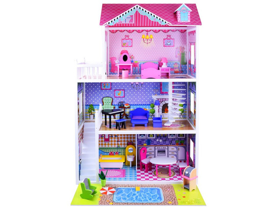 Kto by tam nechcel bývať? Tento krásny trojposchodový drevený domček pre bábiky je plne vybavený, s veľkými, priestrannými izbami, kde si môžete neustále prestavovať krásny drevený nábytok a doplnky.