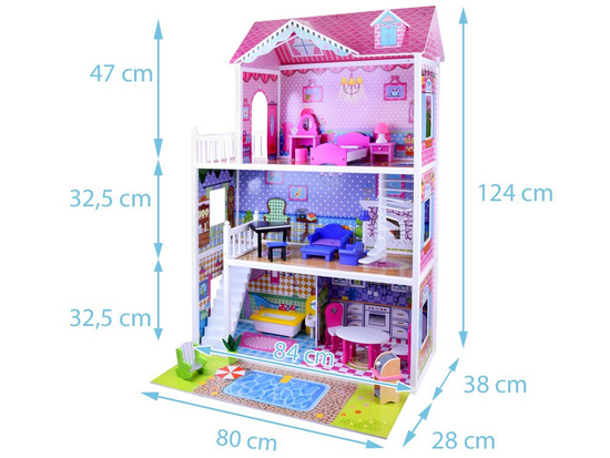 Robustná drevená konštrukcia zaručuje neuveriteľný čas na hranie s domácim majstrom. Tento pôsobivý, veľký domček pre bábiky s nábytkom je veľmi solídne a starostlivo vyrobený. Domček má skutočne pôsobivé rozmery. Skvelé je tiež to, že si deti môžu sami vyzdobiť svoj domov, usporiadať nábytok a hrať sa na interiérového dizajnéra. Domček sa veľmi ľahko montuje.