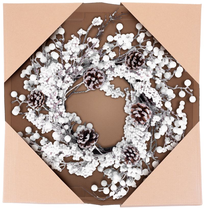Veniec MagicHome by nemal chýbať vo výbave vášho interiéru počas vianočných sviatkov. Je to vkusný veniec so zasneženými guličkami a šiškami. Jeho rozmer je 50x50x14 cm.