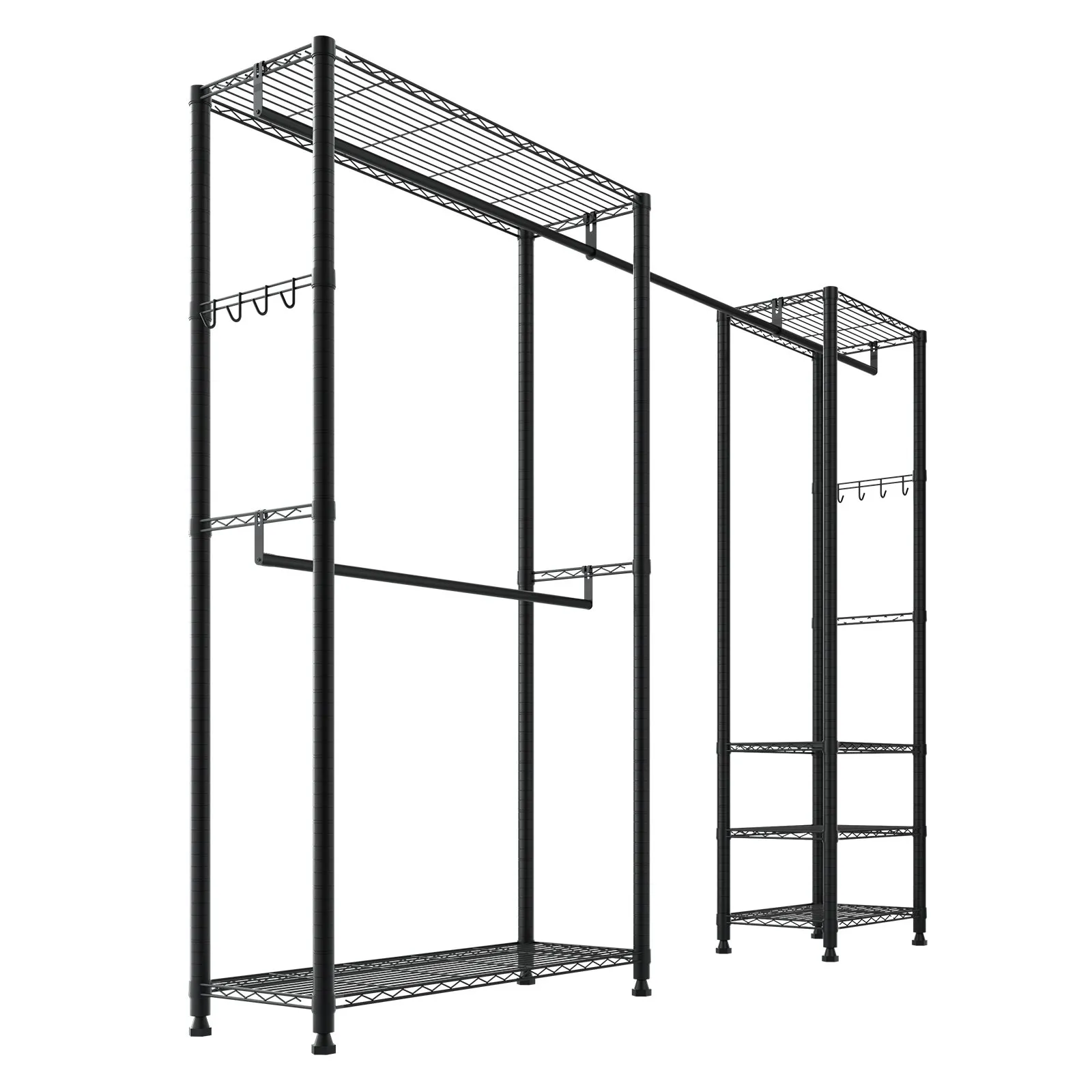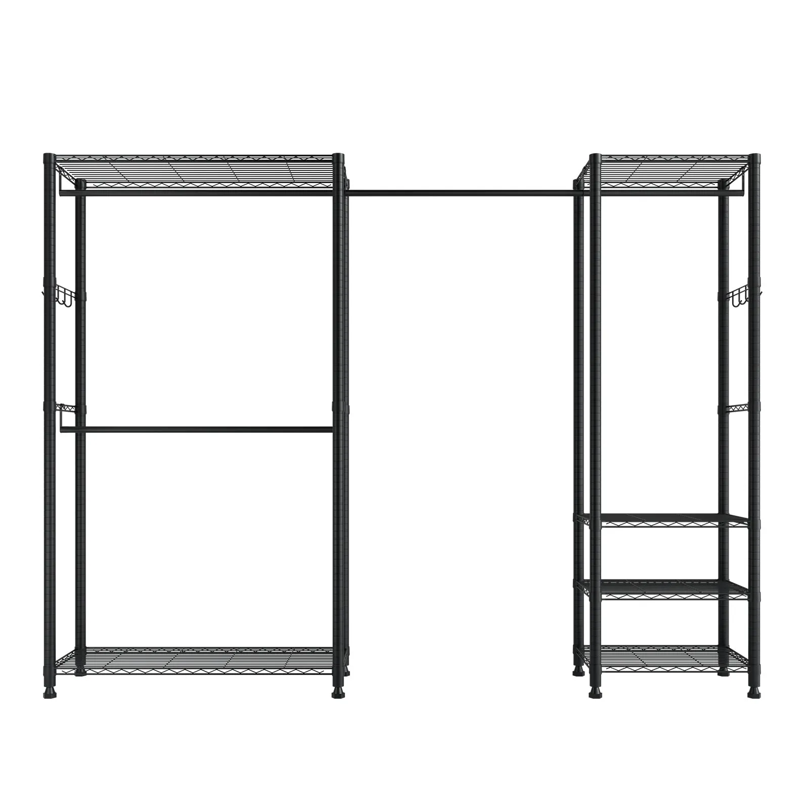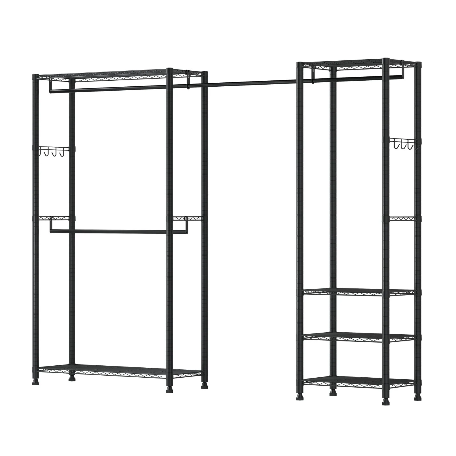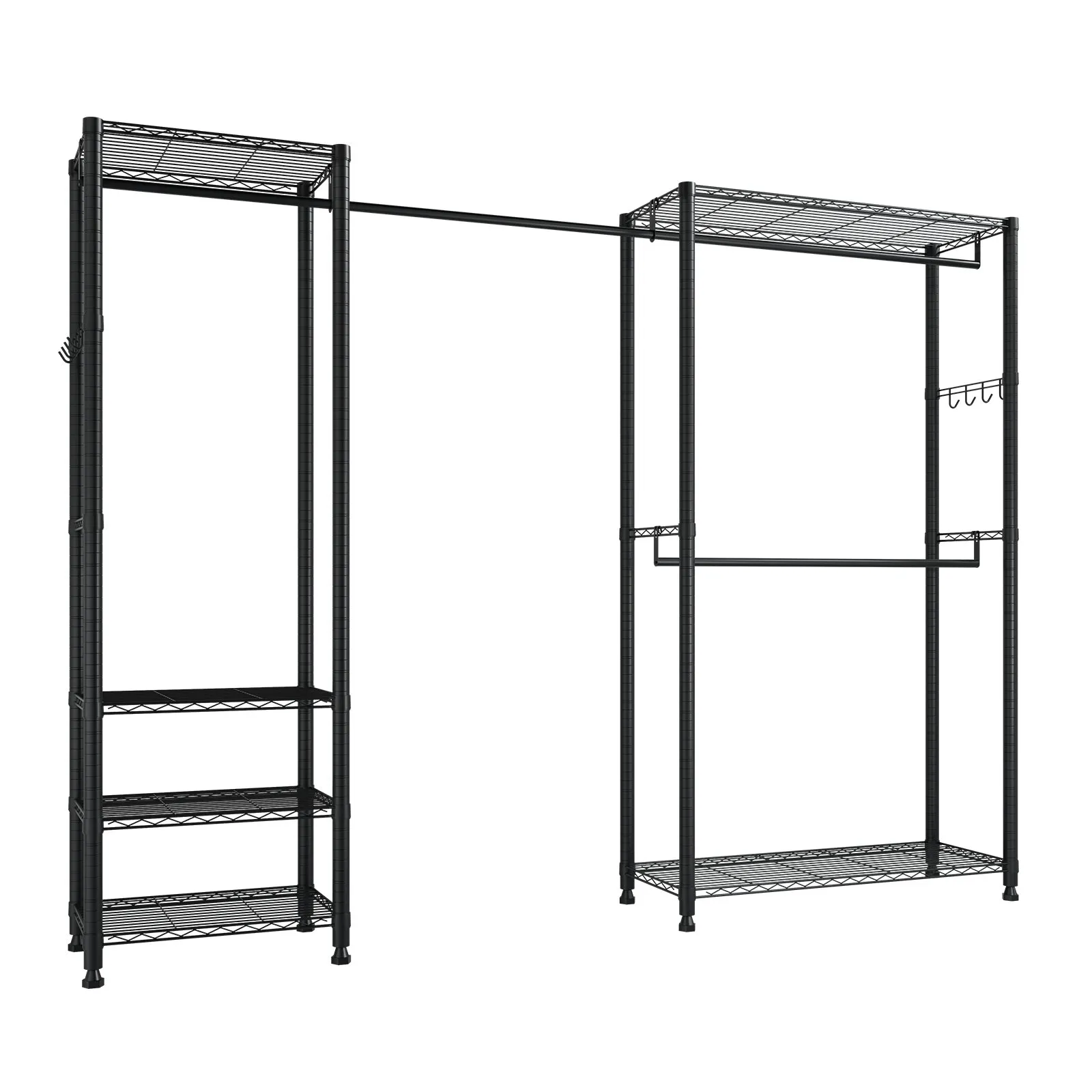• Nastaviteľné police a vešiaky na oblečenie: Tento vešiak na oblečenie je vybavený výškovo nastaviteľnými policami a výsuvnými vešiakmi na oblečenie a ponúka priestor na oblečenie rôznych veľkostí. Police je možné podľa potreby premiestniť, pričom vešiaky na oblečenie sa dajú vysunúť od 71,1 do 132,05 cm (28 až 52 palcov).