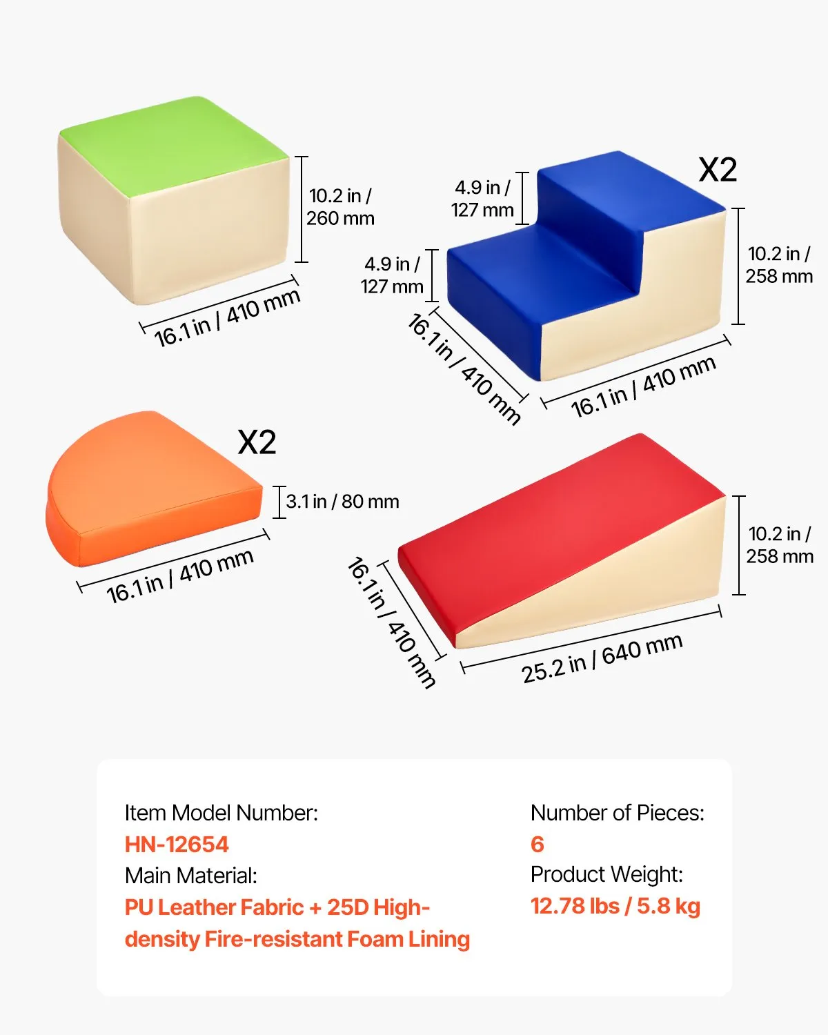 Mäkké stavebné bloky, 6-dielna sada, penové stavebné bloky pre batoľatá od 6 mesiacov do 3 rokov, obrovské stavebné bloky vyrobené z PU kože, sada na hranie na lezenie a lezenie v interiéri a šmýkanie.