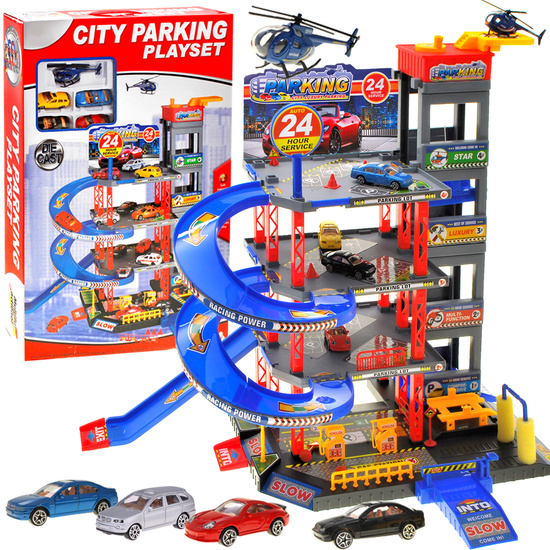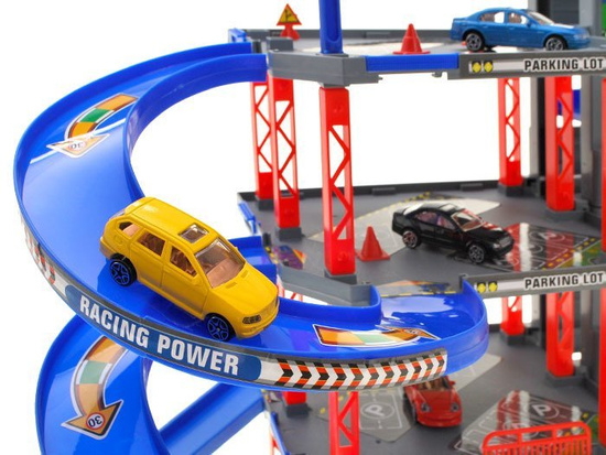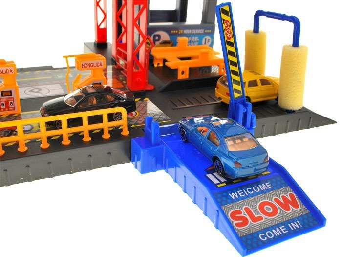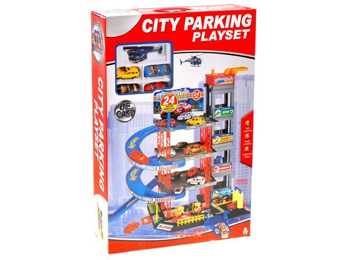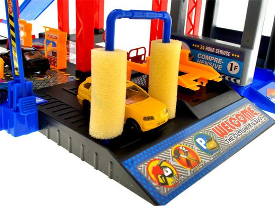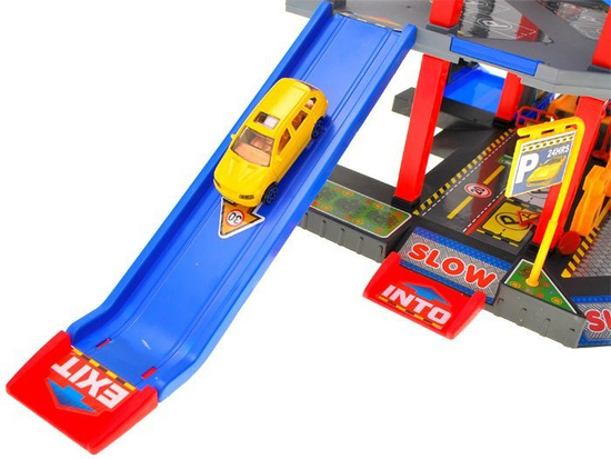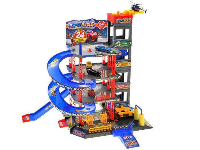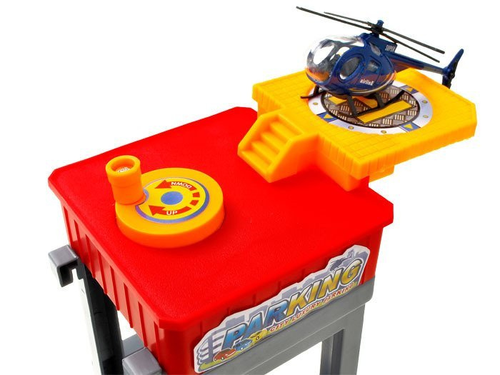 Fantastické viacposchodové parkovisko s čerpacou stanicou, výťahom, autoumyvárňou, autoservisom a heliportom. Parkovisko je vhodné pre „pružinov“. Na vjazd na parkovisko zdvihnite rampu. Výťah umožňuje autu pohybovať sa medzi jednotlivými parkovacími úrovňami. Keď sa vaše auto zašpiní, návšteva autoumyvárne je nevyhnutnosťou a vaše auto bude ako nové. Ak vám dôjde benzín, môžete jednoducho natankovať na čerpacej stanici. Keď potrebujete opraviť auto, použite výťah na opravu zavesenia kolies alebo výmenu pneumatiky. Sada obsahuje mnoho ďalších prvkov, ktoré zvyšujú zábavu, ako sú dopravné značky a kužele.