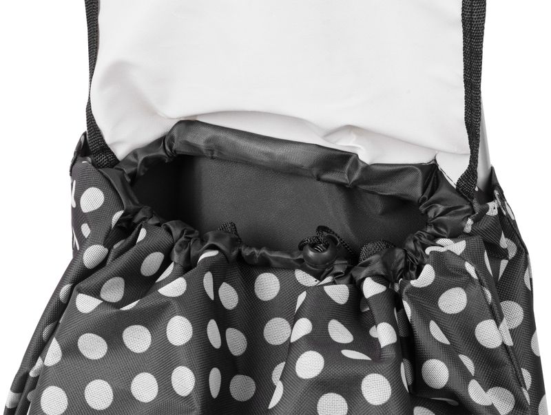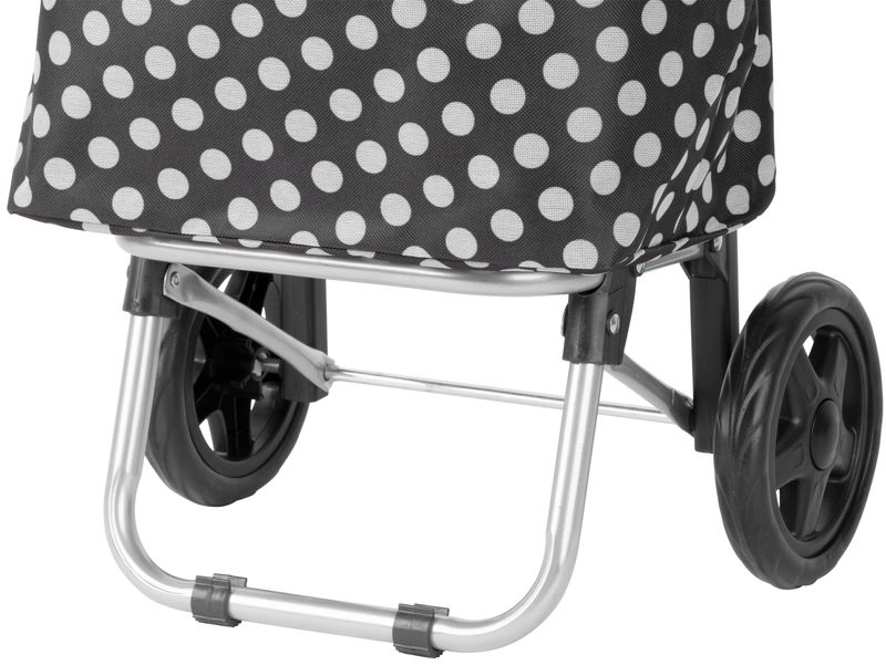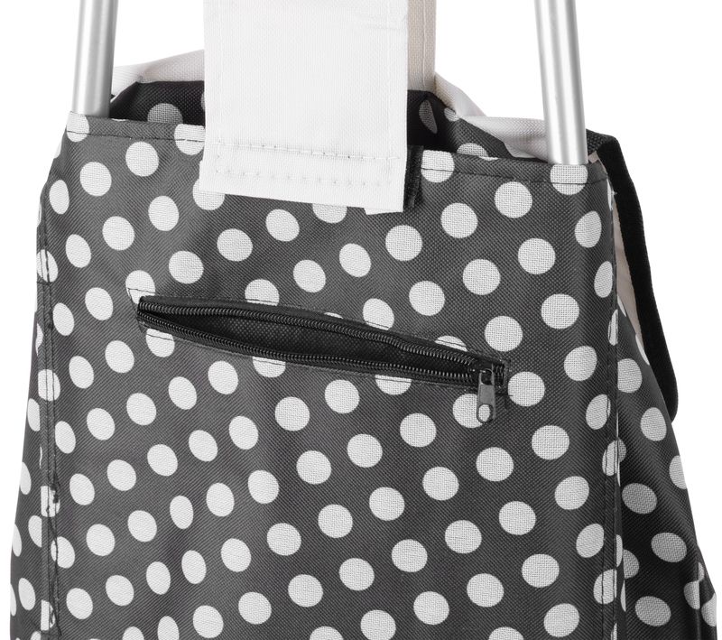 Nákupný vozík Aleš na kolieskach s krásnou elegantnou čiernou potlačou bude Váš pomocník pri každodenných nákupoch. Pohodlná rukoväť. Obsahuje bočné vrecko na zips a sťahovací patent na vrchu. Maximálna nosnosť: 20 kg. Rozmery: 35x30x94 cm