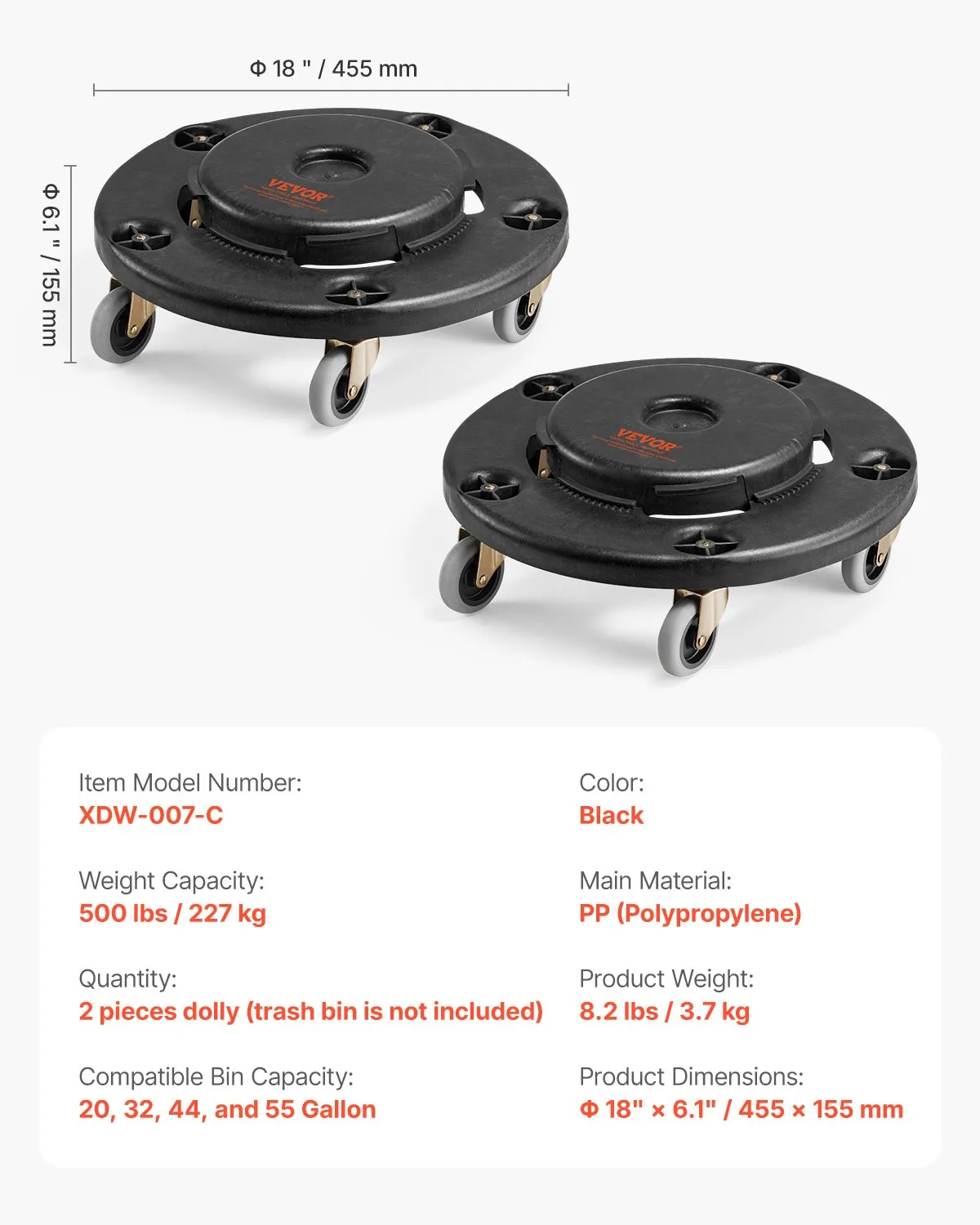 Vozík na odpadkový kôš, vhodný pre koše s objemom 75,7/121/166,6/208 l, balenie 2 kusov. Vozík na odpadkový kôš so 4 uzamykateľnými kolieskami, nosnosť 227 kg, multifunkčný vozík, 455×155 mm