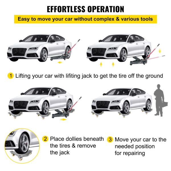 Široké použitie – Široké možnosti využitia, napr: Tieto vozíky sú ideálne pre obchody, garáže a výstavné priestory a umožňujú vám presúvať osobné vozidlá, prívesy, lode, motocykle, lietadlá, nábytok, vybavenie atď. Vozík na kolesá s pneumatikami je ľahký, aby sa dal kdekoľvek uskladniť.
