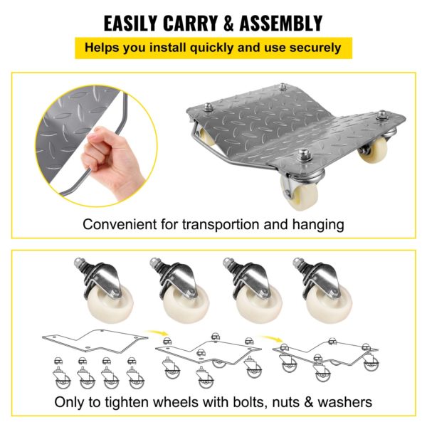 Jednoduché používanie – Stačí len nainštalovať priložené 7,6 cm kolieska s guľôčkovými ložiskami na základňu a potom ste pripravení na pohyb. Každý vozík s kolieskami je vybavený pohodlnou rukoväťou, ktorá vám uľahčí prenášanie náradia na požadované miesto.