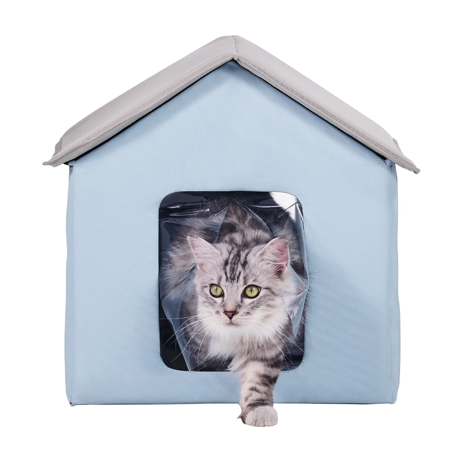 Vyhrievaný mačací domček , vonkajší prístrešok pre mačky s nastaviteľnou teplotou a časovačom, skladací mačací prístrešok vyrobený z oxfordskej látky 600D s vyhrievaným vankúšom pre zimné teplo a pohodlie, modrý (malý)