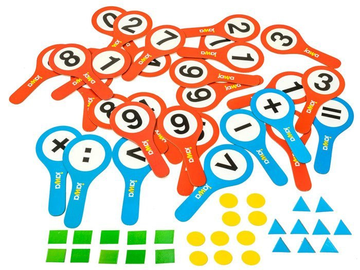 – 7 žetónov s matematickými znakmi (plus, mínus, rovná sa),