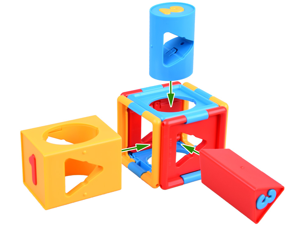 Táto vzdelávacia kocka bola navrhnutá s ohľadom na vývojové potreby dvojročných detí. Táto magická kocka je navrhnutá tak, aby učila a rozvíjala mozog, ruky a zručnosti dieťaťa. Rozkladacia kocka mu umožní oboznámiť sa s číslami, geometrickými útvarmi a tvarmi. Kocka mu pomáha získať základné vedomosti o geometrických tvaroch, rozlišovať medzi predmetmi rôznych veľkostí a priraďovať ich k otvorom v správnom poradí, aby vytvorili tvar.