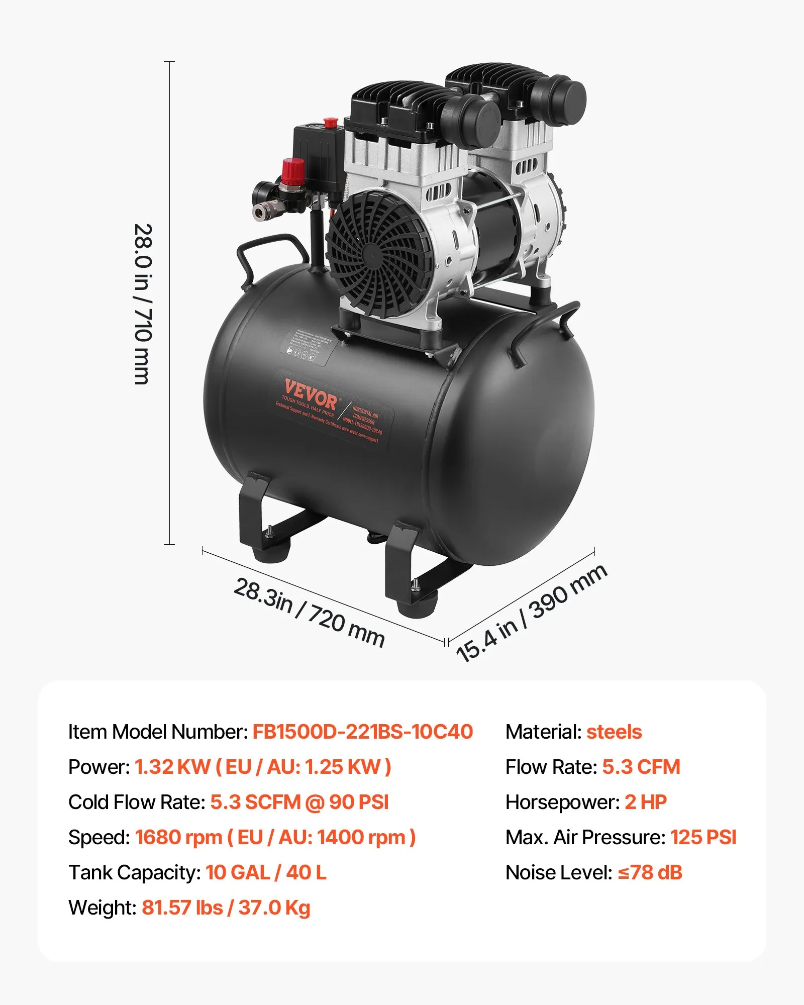 Vzduchový kompresor s objemom 10 galónov/40 l: Náš bezolejový motor s výkonom 1,25 kW poháňa kompresor na rýchlosť 1400 ot./min. a 5,3 CFM pri tlaku 90 PSI. Je ideálny na podporu rôznych pneumatických a vzduchových nástrojov, ako sú klincovačky, rázové uťahováky, striekacie pištole a pneumatické skrutkovače. Najlepšie sa hodí na hustenie pneumatík, opravy automobilov, striekanie farieb, zabíjanie klincov do dreva a ďalšie.