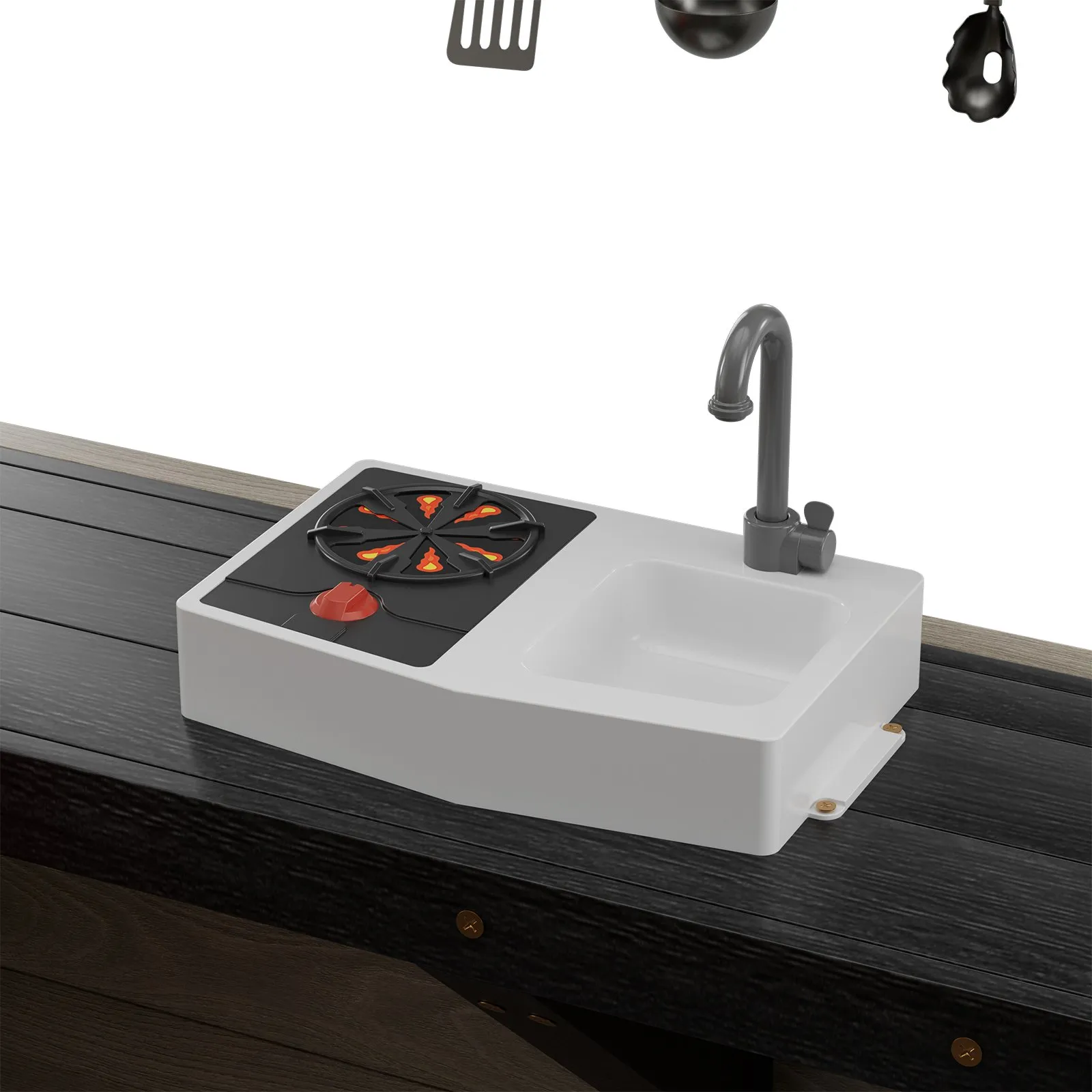 Plne vybavená kuchynská časť: Vnútorná kuchynská časť je vybavená drezom a batériou, dvoma druhmi riadu a špachtľami, čím pripomína skutočnú kuchyňu. V tomto domčeku sa deti môžu stať malými kuchármi a zažiť radosť z varenia.