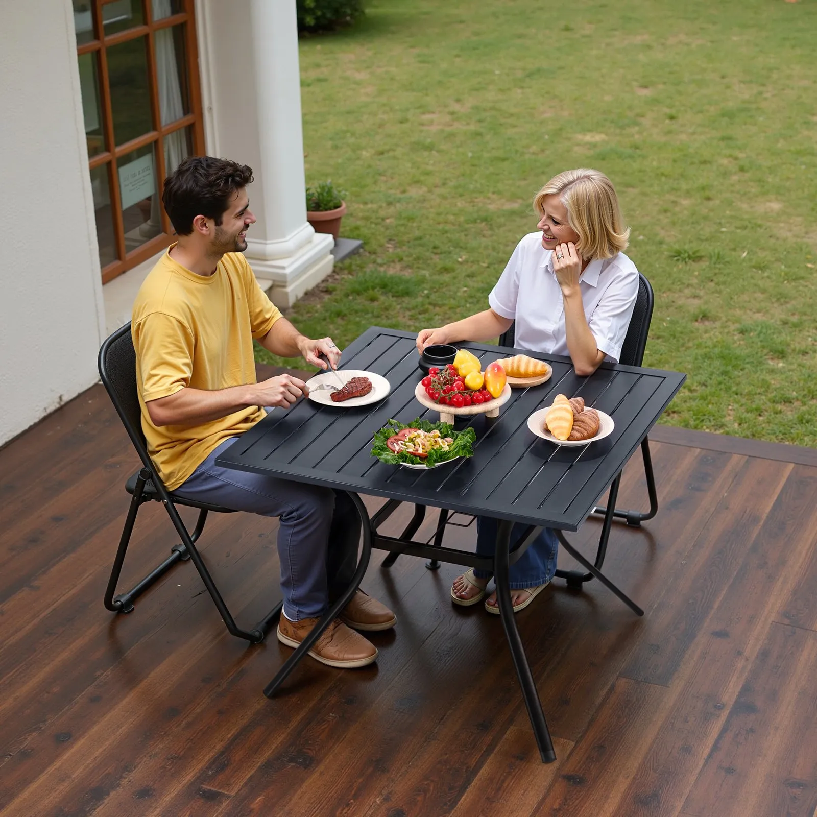Všestranné využitie: Náš jedálenský stôl je ideálny na terasy, záhrady, balkóny, verandy alebo predné a zadné dvory. Je všestranný a praktický, ideálny na grilovanie, stretnutia a večierky – skvelý doplnok do každého vonkajšieho priestoru.
